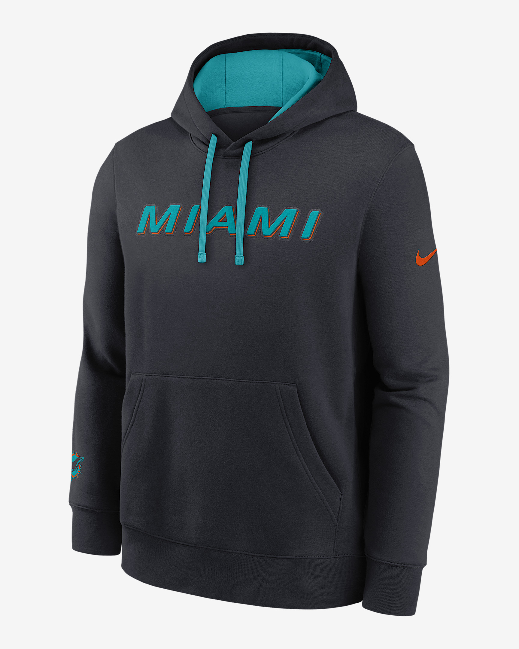 This Miami Dolphins Rivalries Collection Club Hoodie is a homage to the relentless swagger of an apex predator. A dark blue backdrop with unmistakable orange accents represents a team that hunts in deep waters. During chilly temperatures, cozy fleece lining helps you comfortably support the squad that’s as fierce as they come. Product Details - Front pocket - Hood with drawstring - Shown: Navy - Style: 2KDK0GKI9P-341