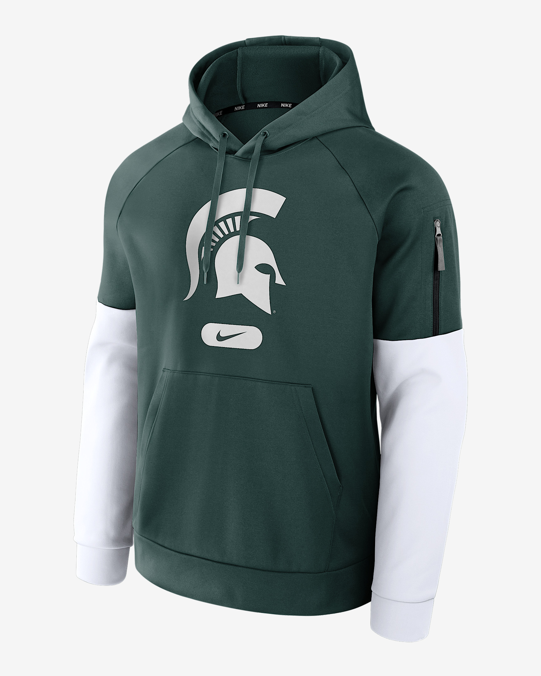 The Michigan State Spartans Fitness Hoodie combines heat-trapping performance fabric with sweat-wicking technology to help you stay cozy in chilly conditions. It soft, 2-way stretch design features the team logo front and center. Benefits - Nike Therma fabric helps keep you warm. - Nike Dri-FIT technology moves sweat away from your skin for quicker evaporation, helping you stay dry and comfortable. - Double-knit pique fabric helps add structure and stability. - Dropped shoulder seams help create an oversized look. Product Details - Front pocket - Hood with drawstring - Zippered pocket on right sleeve - 100% polyester - Machine wash - Imported - Shown: Pro Green - Style: 02V6024NMST-6ZS