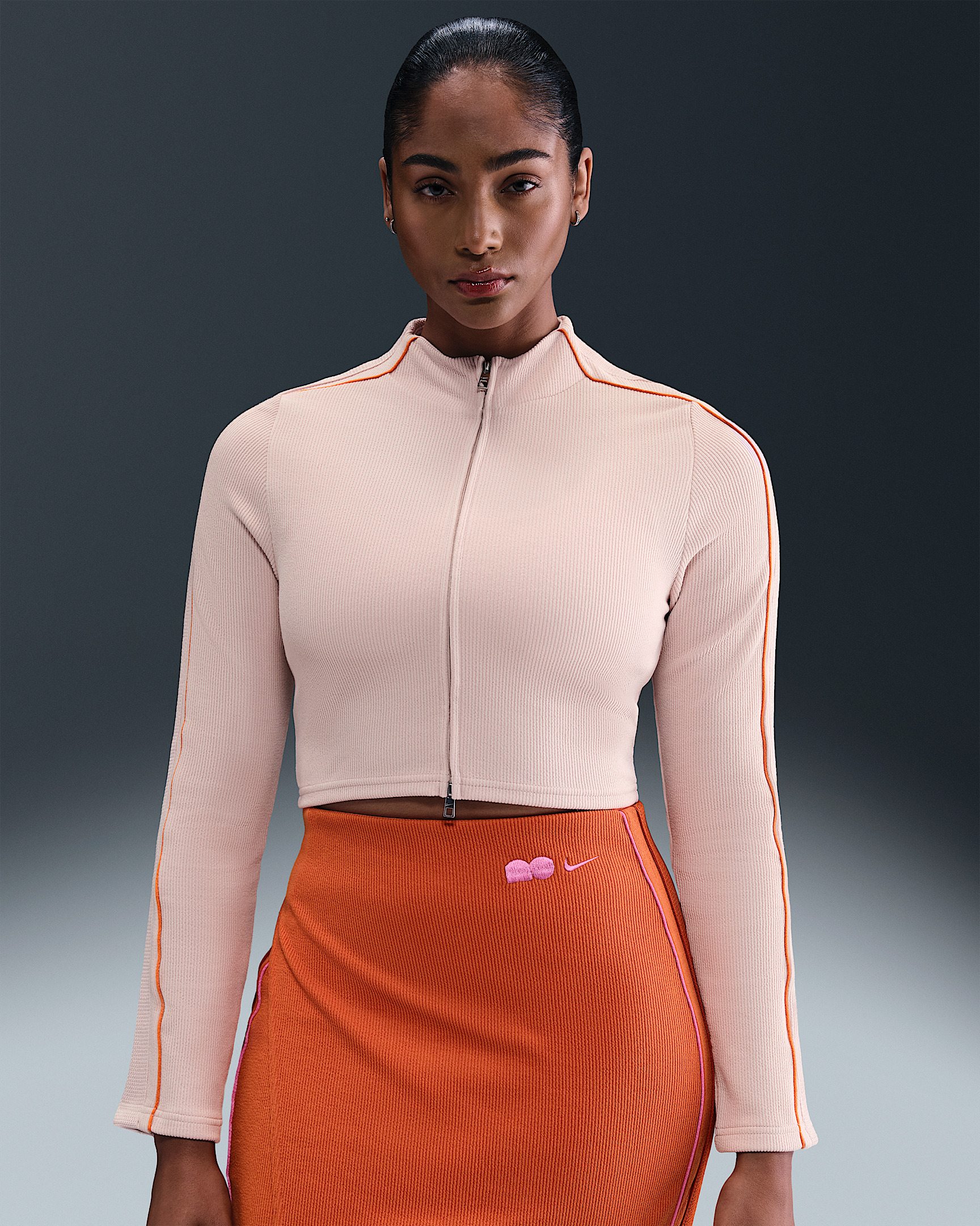 With Naiomi Osaka's input, we designed this top as a nod to heritage tennis. This body-skimming style is made from heavyweight knit that has structure and enough stretch for a comfortable feel. For stying versatility, we added a 2-way zipper so you can wear it your way. Product Details - 69% polyester/27% cotton/4% spandex - Zipper with branded NO pull - Embroidered NO and Swoosh logos - Machine wash - Imported - Shown: Silt Red/Campfire Orange/Pinksicle - Style: HV2084-667 SIZE & FIT Tight fit: snug and form-fitting