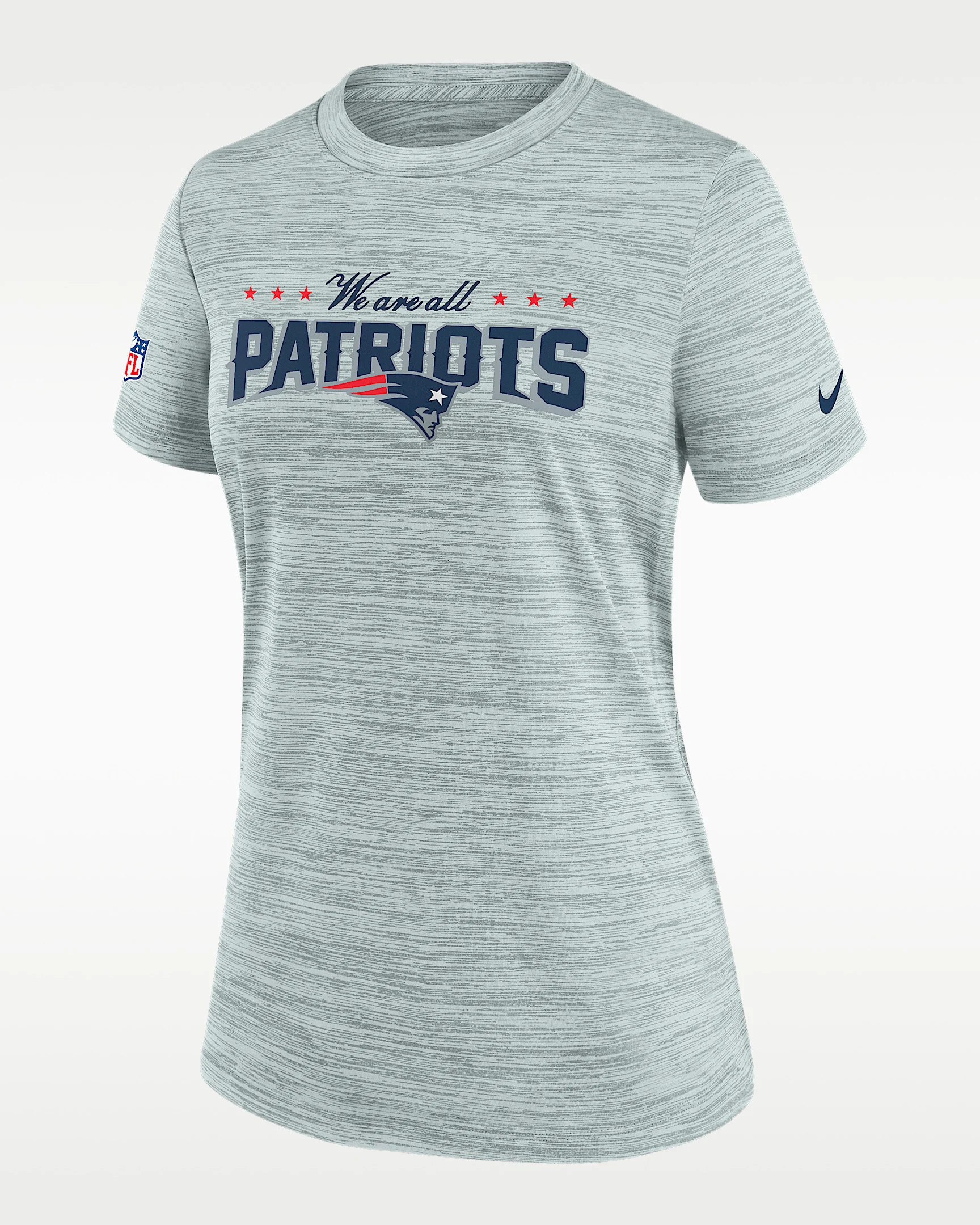 The New England Patriots Rivalries Collection Sideline Velocity T-Shirt is inspired by harsh elements, historic runs and a fandom handed down from generation to generation. A cross-dyed pattern accentuates the team details with six stars representing the six states and six rings that cement the franchise’s legacy. Lightweight polyester combined with sweat-wicking technology helps keep you cool and dry in this exclusive shirt. Benefits - Nike Dri-FIT technology moves sweat away from your skin for quicker evaporation, helping you stay dry and comfortable. - Jersey fabric has a soft, lightweight feel. Product Details - Shown: Silver - Style: 03EY07R8K-4WR
