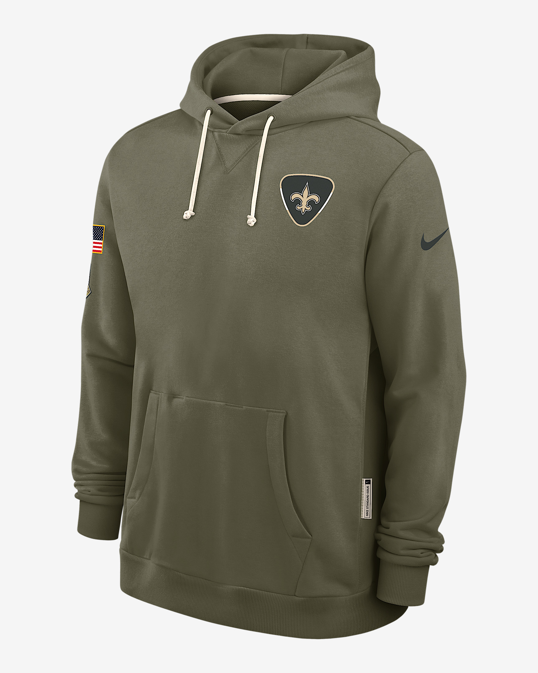 Featuring a military-inspired design, the Salute to Service Sideline Dominant Force Hoodie combines sweat-wicking technology with a soft fleece lining to help you comfortably support the New Orleans Saints and active or retired service members in cooler weather. Benefits - Nike Dri-FIT technology moves sweat away from your skin for quicker evaporation, helping you stay dry and comfortable. - Dolman sleeves help increase range of motion with a roomy fit under the arms. Product Details - Hood with drawstring - Front pocket - Zippered pocket at right side - 53% polyester/47% cotton - Machine wash - Imported - Shown: Olive - Style: 03AZ2DHA2M-D4V