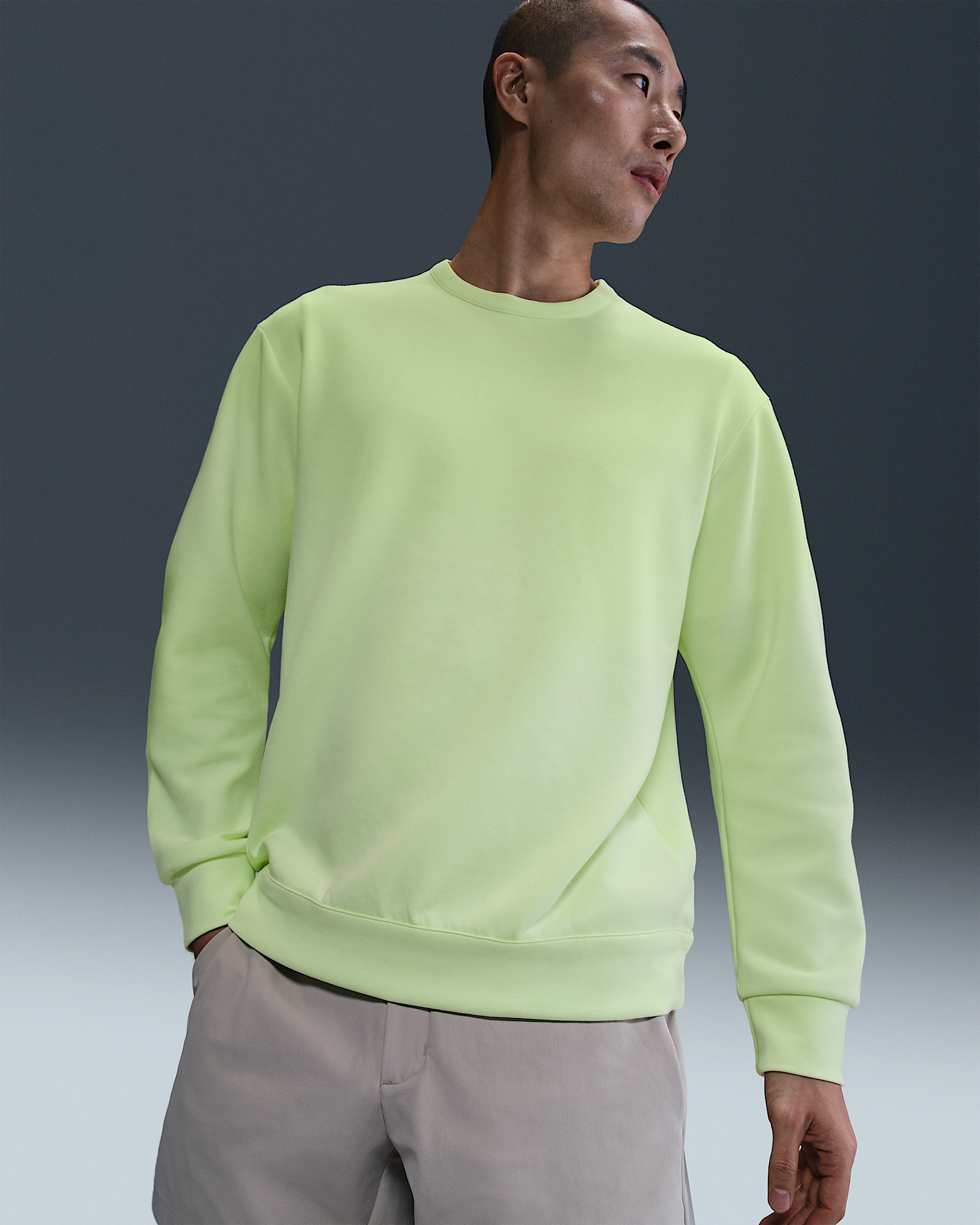 Extraordinarily soft and smooth, our ImpossiblySoft fabric feels made for all-day motion. This double-knit crew is built with clean lines and sweat-wicking Dri-FIT technology for the ultimate comfort on the go. Benefits - Nike Dri-FIT technology moves sweat away from your skin for quicker evaporation, helping you stay dry and comfortable. - Raglan sleeves and articulated elbow construction help you move freely and naturally. Product Details - Signature locker loop on back collar - 51% polyester/25% modal/15% cotton/9% spandex - Machine wash - Imported - Shown: Barely Volt/Volt Ice - Style: HQ6964-701 SIZE & FIT Model is wearing size M and is 6′1″185cm Big & Tall model is wearing size 2XL and is 6'2"188cm Loose fit: roomy and relaxed
