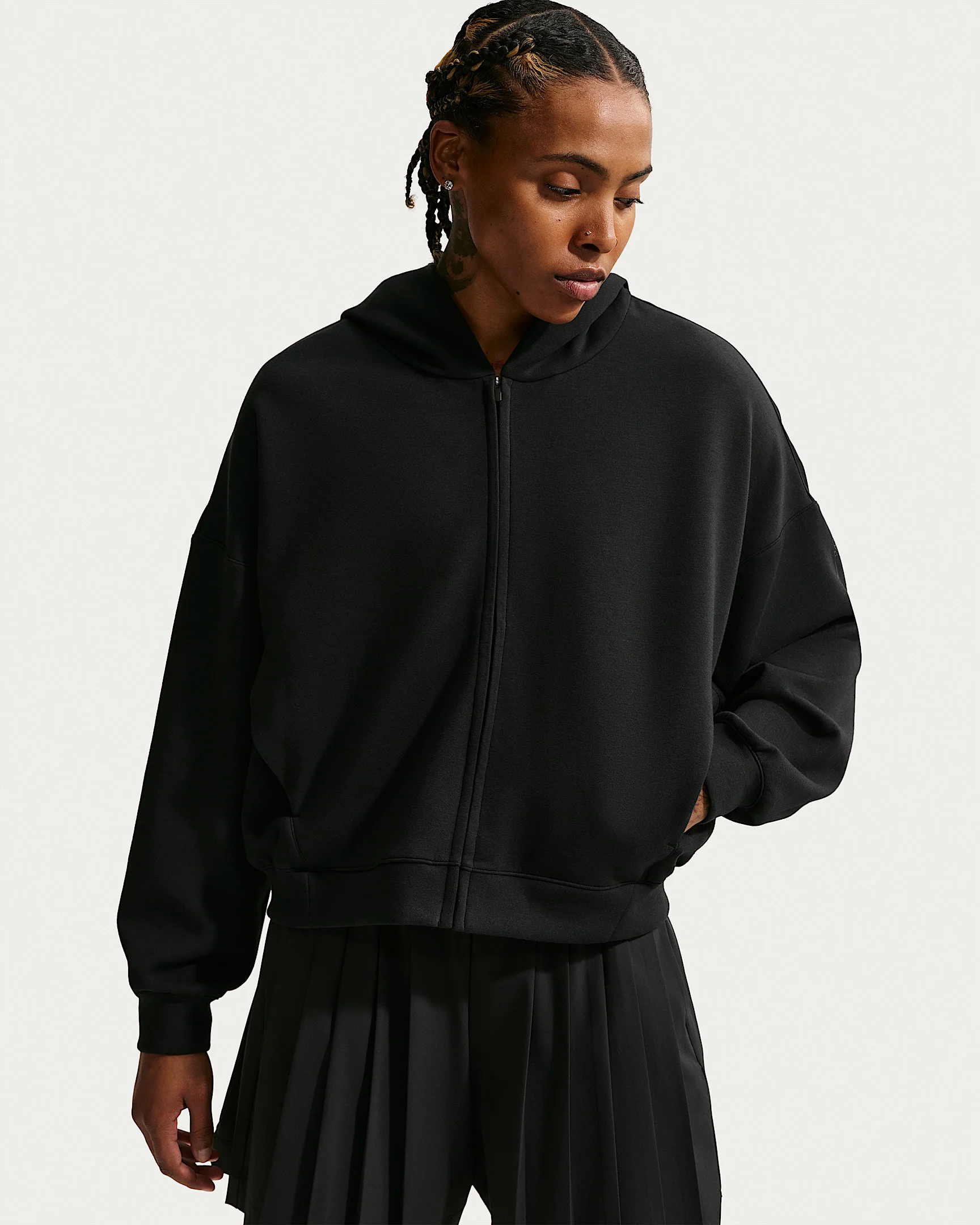 Extraordinarily soft and smooth, our ImpossiblySoft fabric feels made for all-day motion. This oversized full-zip hoodie is built with clean lines and sweat-wicking Dri-FIT technology for the ultimate comfort on the go. Benefits - Nike Dri-FIT technology moves sweat away from your skin for quicker evaporation, helping you stay dry and comfortable. - Oversized fit for a spacious feel and easy layering. Product Details - Side pockets - Signature locker loop on back collar - Body: 51% polyester/25% modal/15% cotton/9% spandex; Hood lining: 100% cotton - Machine wash - Imported - Shown: Black/Dark Smoke Grey - Style: IR1924-011 SIZE & FIT Oversized fit: exaggerated and spacious