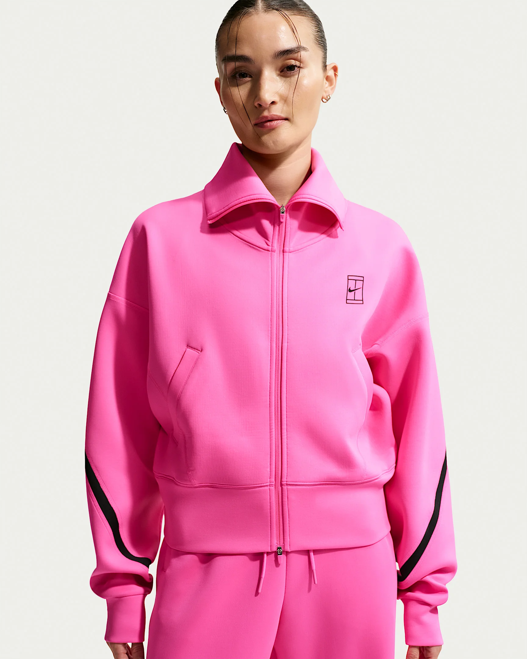 Ready for the press tent, this jacket reimagines classic warm-ups for today's best tennis players. Made with a sweat-wicking, midweight fabric, it offers versatile warmth so fielding those tough questions is no sweat. Benefits - Nike Dri-FIT technology moves sweat away from your skin for quicker evaporation, helping you stay dry and comfortable. - Irresistibly smooth and sleek, this premium fabric feels soft and airy, with the perfect amount of flex and stretch for all of your moves. Product Details - Hand pockets - Dropped shoulders - Elongated hem, collar and cuffs - Silicone NikeCourt logo - 93% Polyester/7% spandex - Machine Wash - Imported - Shown: Laser Fuchsia/Black - Style: IB0776-617 SIZE & FIT Standard fit: easy and traditional