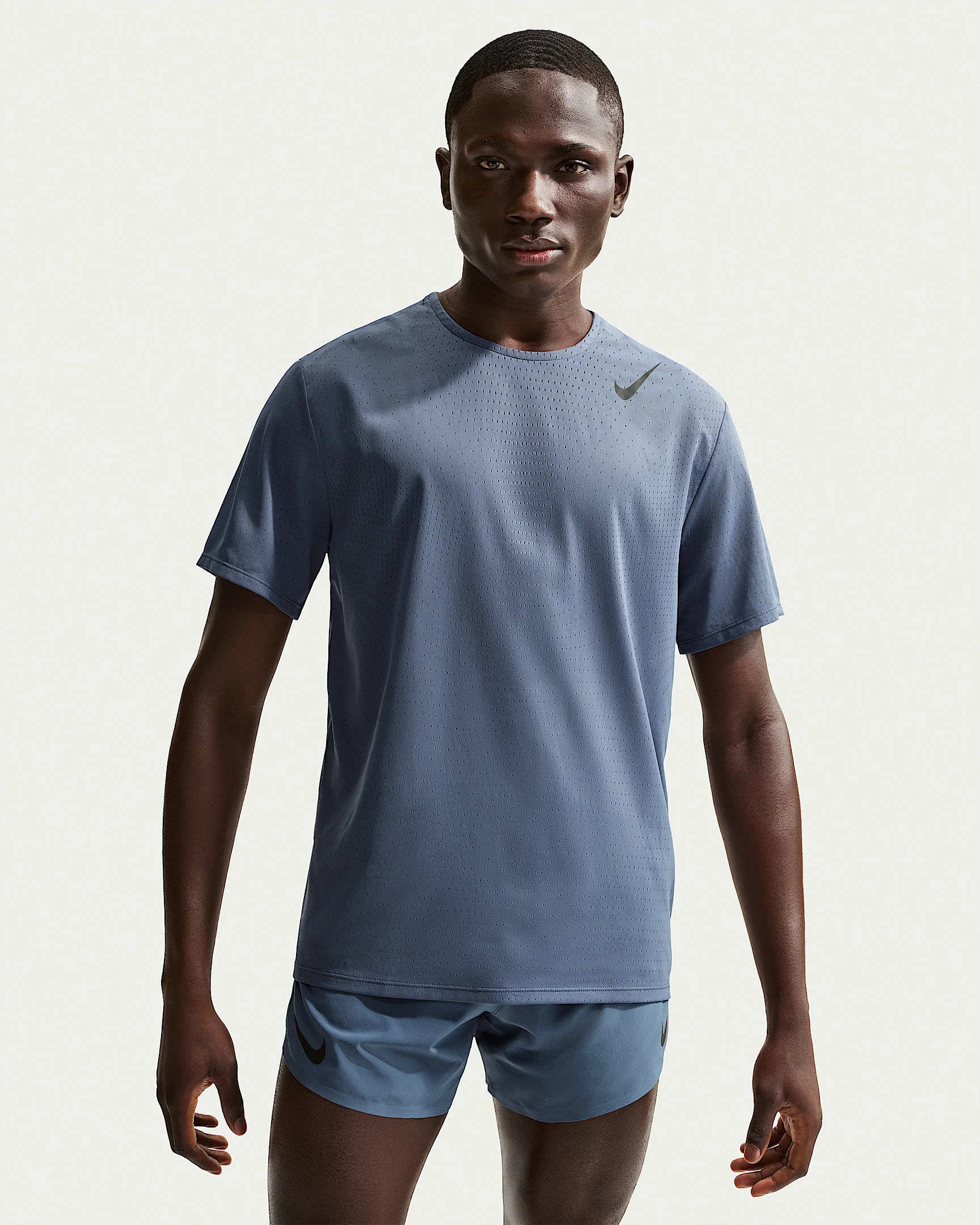 Built for speed, the AeroSwift collection is our pinnacle racing gear. This sweat-wicking engineered-knit top is lightweight and ultra-breathable to help keep you cool through the finish line. Benefits - Nike Dri-FIT ADV technology combines moisture-wicking fabric with advanced engineering and features to help you stay dry and comfortable. - Engineered knit fabric is lightweight and breathable. - Bonded seams at the shoulder reduce bulk for a lighter feel. - Swoosh logos have a non-reflective finish that won't catch flash photography during the race. Product Details - 100% polyester - Machine wash - Imported - Shown: Diffused Blue/Black - Style: HJ3377-491 SIZE & FIT Model is wearing size M and is 6'1"184cm Standard fit: easy and traditional