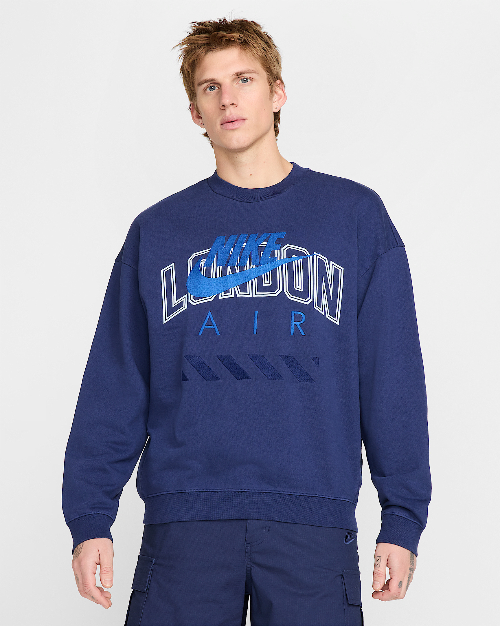 Rep your city in this Nike Air crew. The heavyweight French terry fabric is garment washed to create a rugged, worn-in look and feel from day 1. The oversized fit is complemented by an oversized embroidered Nike Air logo. Product Details - Embroidered Nike Air logo - Body: 100% cotton. Rib: 98% cotton/2% spandex. - Machine wash - Imported - Shown: Blue Void/University Red/Game Royal - Style: HQ1099-492 SIZE & FIT Model is wearing size M and is 6′0″183cm Big & Tall model is wearing size 3XL and is 6'6"198cm Oversized fit: exaggerated and spacious