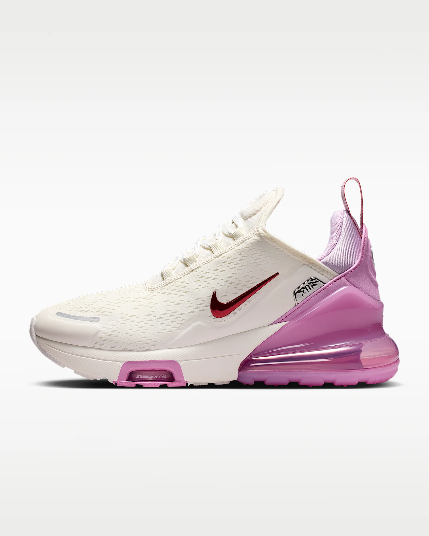 Nike's first lifestyle Air Max brings you style, comfort and big attitude in the Nike Air Max 270. The design draws inspiration from Air Max icons, showcasing Nike's greatest innovation with its large window and fresh array of colors. Benefits - Max Air 270 unit delivers all-day cushioning. - Woven and synthetic fabric on the upper provides a lightweight fit and airy feel. - Foam midsole feels soft and comfortable. - Stretchy inner sleeve and bootie-like construction creates a personalized fit. - Rubber on the outsole adds traction and durability. Product Details - Mesh details - 2-piece midsole - Shown: Sail/Light Magenta/Metallic Silver/Light Crimson - Style: IO9884-113