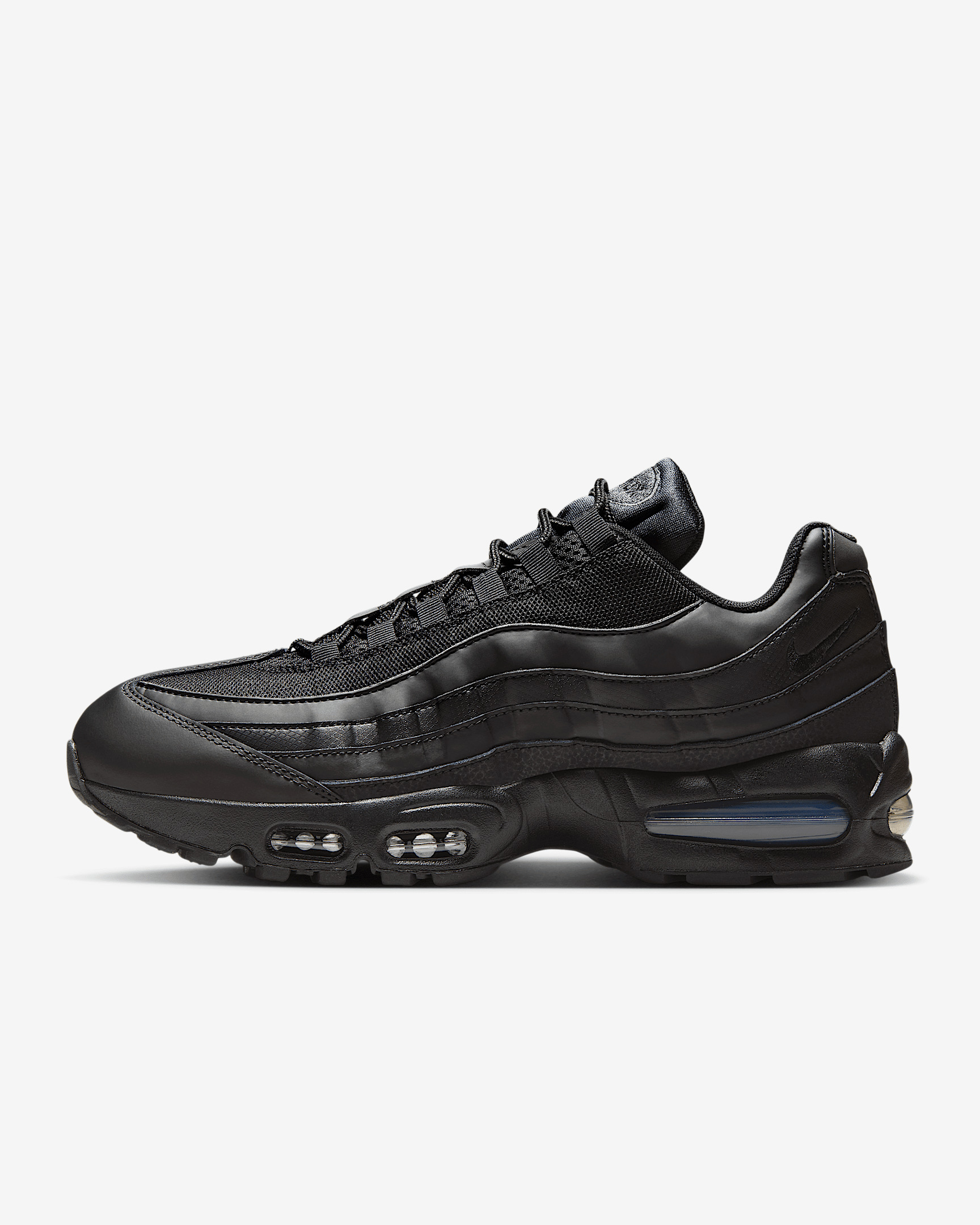 Taking inspiration from the human body and '90s track aesthetics, the Air Max 95 mixes unbelievable comfort with fast-paced style. The wavy side panels add natural flow to any outfit while visible cushioning in the heel and forefoot delivers performance comfort. Benefits - Upper combines real and synthetic leather with airy textiles for a layered look built to last. - Visible Max Air cushioning provides lightweight cushioning. - Flex grooves in the midsole/outsole let you move freely. - Inspired by the human anatomy, the midsole/outsole represent the spine, upper panels are the muscles and the laces are the shoe’s ribs. Product Details - Foam midsole - Rubber outsole - Not intended for use as Personal Protective Equipment (PPE) - Shown: Black/Black/Anthracite/Black - Style: HM8755-001