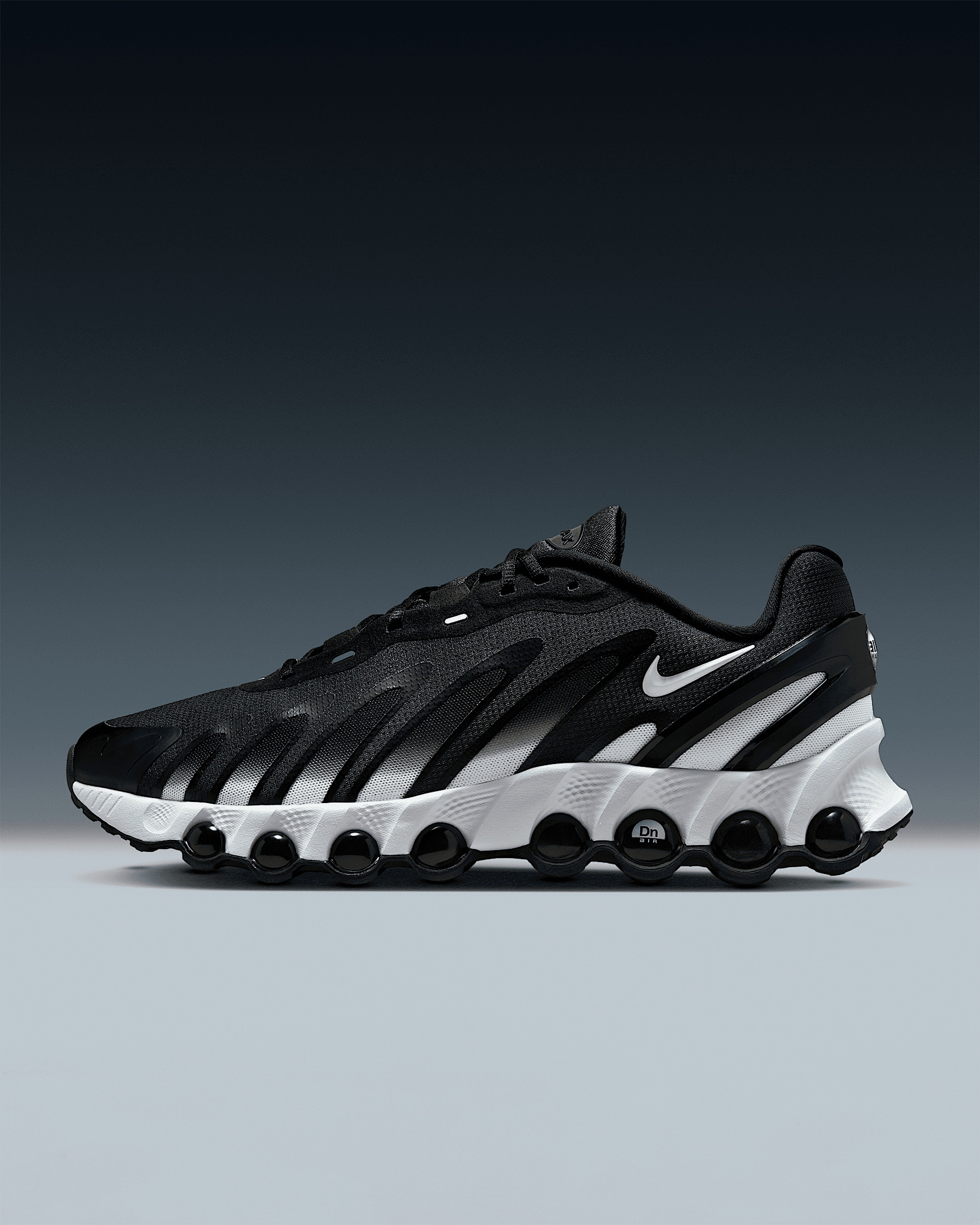 More Air, less bulk. The Dn8 takes our Dynamic Air system and condenses it into a sleek, low-profile package. Powered by eight pressurized Air tubes, it gives you a responsive sensation with every step. Enter an unreal experience of movement. More Benefits - Plastic heel clip helps hold your foot down for more containment. - Extra layer across toe tip adds durability. Product Details - Foam midsole - Rubber outsole - Shown: Black/Black/Black/White - Style: FQ7860-007