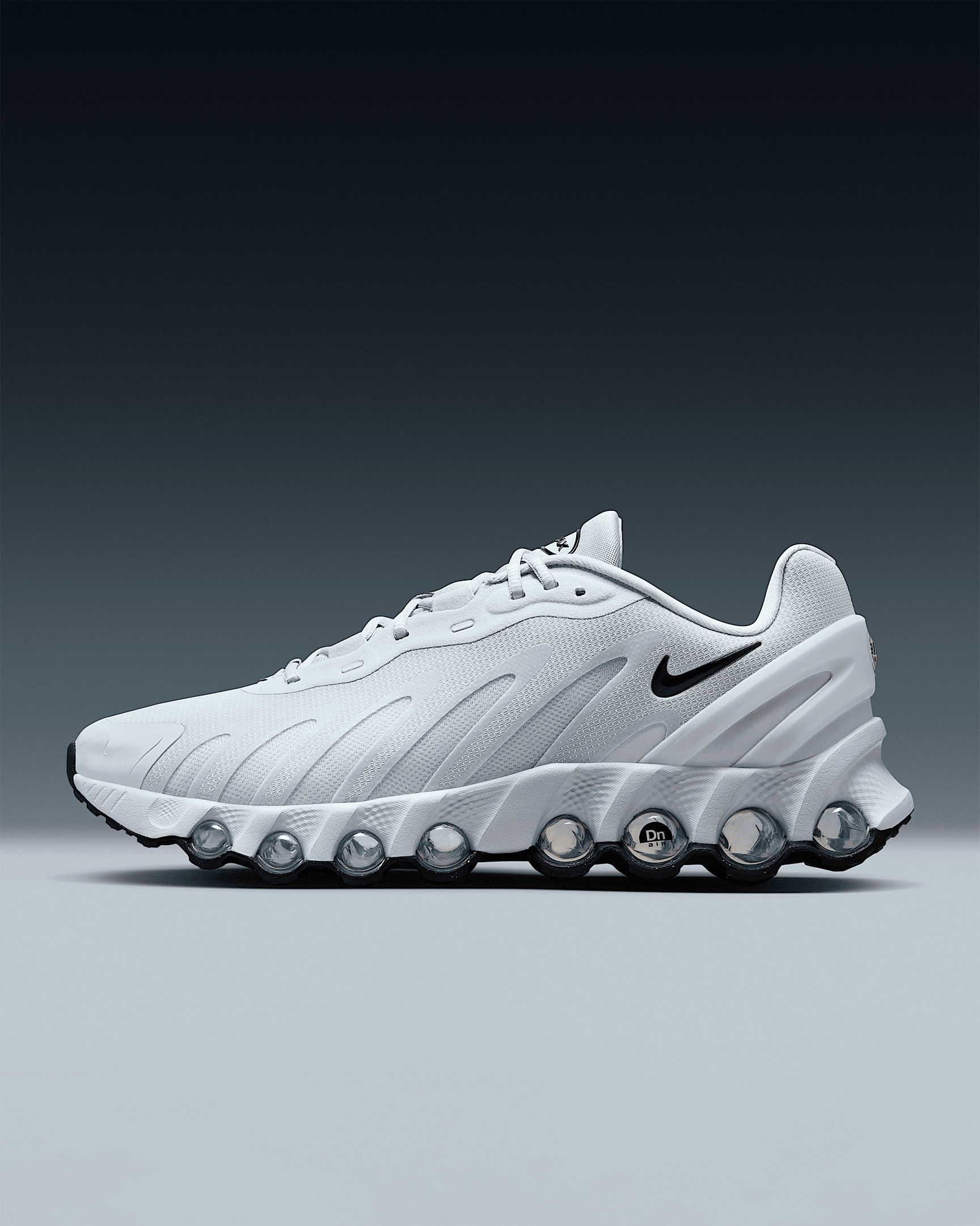 More Air, less bulk. The Dn8 takes our Dynamic Air system and condenses it into a sleek, low-profile package. Powered by eight pressurized Air tubes, it gives you a responsive sensation with every step. Enter an unreal experience of movement. More Benefits - Plastic heel clip helps hold your foot down for more containment. - Extra layer across toe tip adds durability. Product Details - Foam midsole - Rubber outsole - Shown: Pure Platinum/Pure Platinum/Black/Black - Style: FQ7860-010