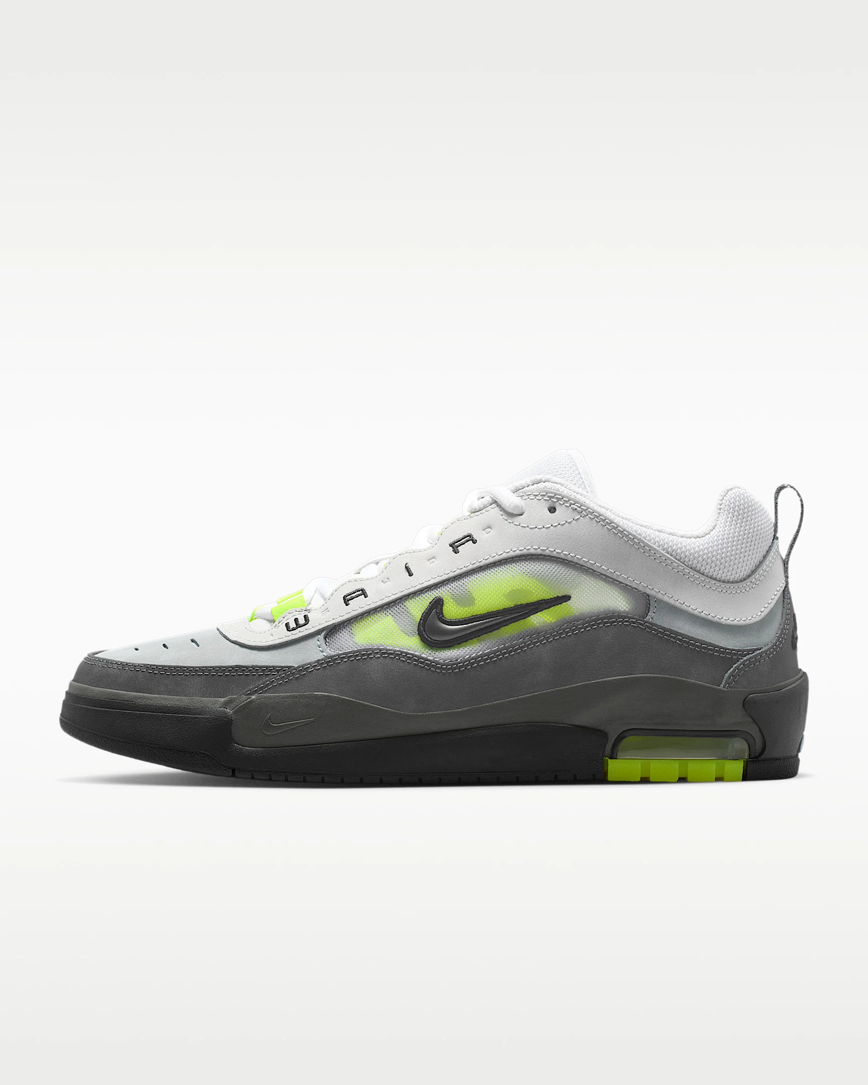 Infused with elements taken from iconic '90s hoops shoes, the Air Max Ishod is built with all the durability you need to skate hard. This creative twist on the original Ishod design features updated mesh, exposed Nike Air and a cupsole that breaks in easily. Benefits - "Ishod" debossed on the hidden eyestays, with "Wair" embroidered on top. - Cupsole designed with flexibility to help minimize necessary break-in time. - Herringbone pattern on the outsole grips your board just right. - Plush and comfortable, Max Air cushioning has just the right amount of support. Product Details - Shown: Black/Anthracite/Light Graphite/Neon Yellow - Style: IR1887-002