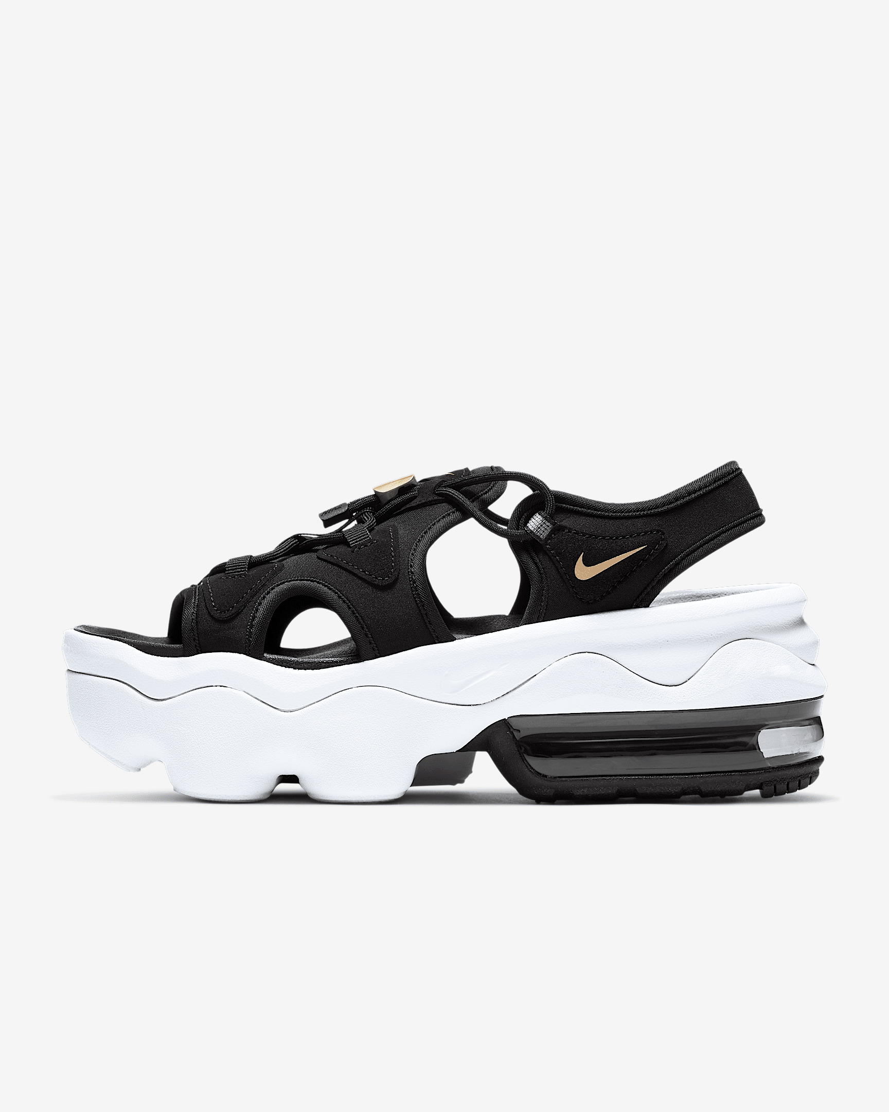 Heat up the streets in the Nike Air Max Koko Sandal. Designed for women, this pinnacle platform-height sandal adds a splash of colorful Air in the heel. The thick, layered foam midsole provides a smooth and flexible ride. Premium details on the upper add texture and dimension to elevate your look. Benefits - The Nike Air cushioning in the the heel feels comfortable and adds coveted Air Max style. - The layered midsole feels soft and delivers underfoot cushioning while its raised height adds a sporty, summertime look. - The speed lacing system adds a playful look while making it easier to put them on and take them off. - Textile upper feels soft and comfortable with or without socks. Product Details - Shown: Black/Anthracite/White/Metallic Gold - Style: CW9705-001