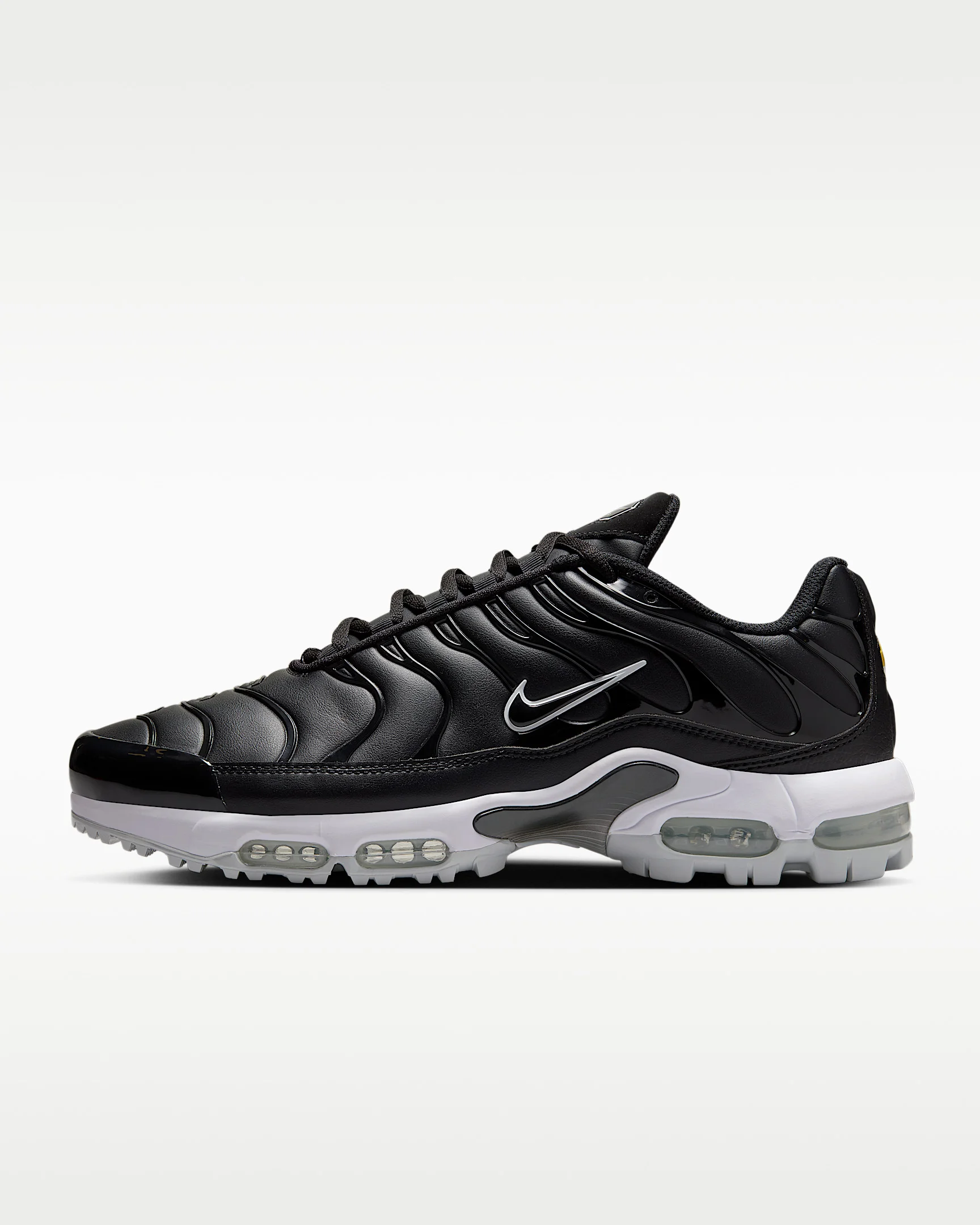 See it, believe it, then put all your swing power into a street legend that’s lending itself to the links. This Air Max Plus combines the design features that made the Plus famous with waterproof material and a traction pattern made for 18 holes. Benefits - Waterproof material on the upper helps keep you dry in wet-weather conditions. - Tuned Air Zoom unit in the forefoot delivers a soft ride while helping to keep you stable. - Max Air in the heel gives you support. - Rubber lugs made of wet traction rubber offer great grip in any condition. - Internal cage combines with a web lacing system that provides lateral stability and a seamless fit. - Strong midfoot plate provides lateral stability. Product Details - Not intended for use as Personal Protective Equipment (PPE) - Shown: Black/Gold/Salsa Red/White - Style: FZ4150-001