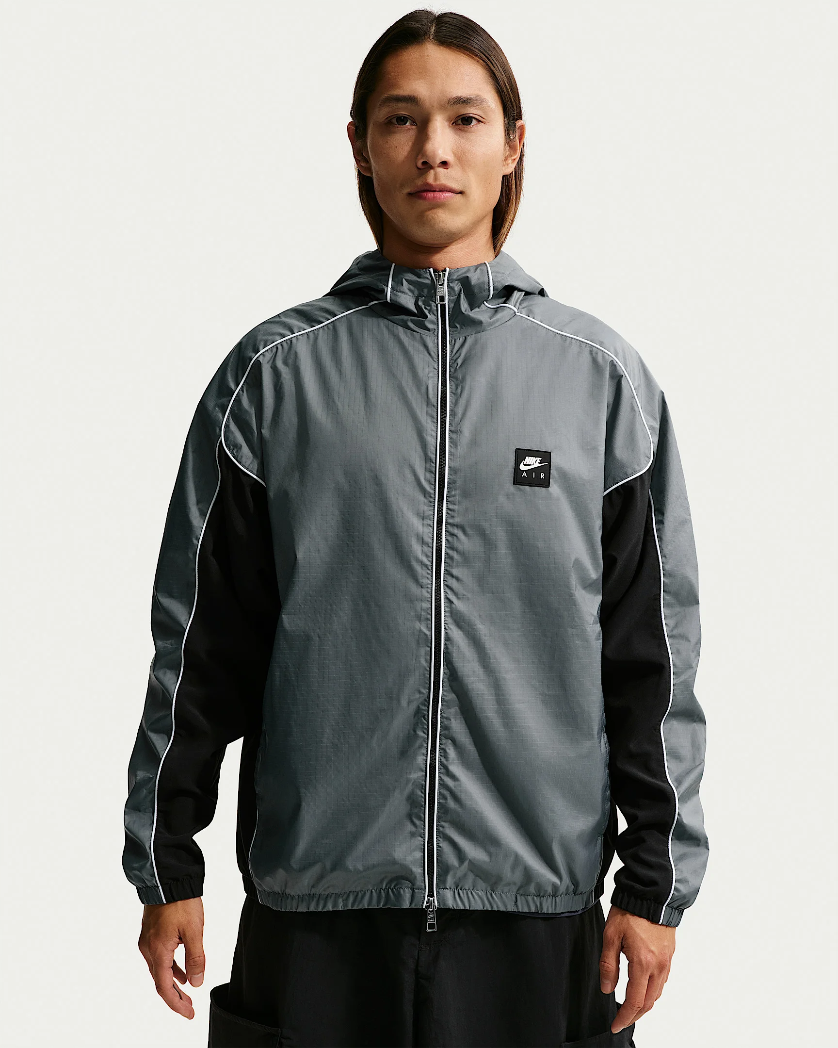 Sport style reimagined for everyday wear. This track jacket is made with water-repellent, woven ripstop fabric to help provide coverage from light rain. Sweat-wicking, slightly stretchy side panels offer cool comfort and ease of movement. Its roomy fit through the body makes layering easy. Product Details - Embroidered back logo - Two-way zipper - Hood with drawcord - Hand pockets - Elastic hem and cuffs - Body: 100% polyester. Panels: 88% polyester/12% spandex. Lining: 100% nylon. - Machine wash - Imported - Shown: Smoke Grey/Black/White - Style: IO0558-084 SIZE & FIT Model is wearing size M and is 5′11″180cm Loose fit: roomy and relaxed