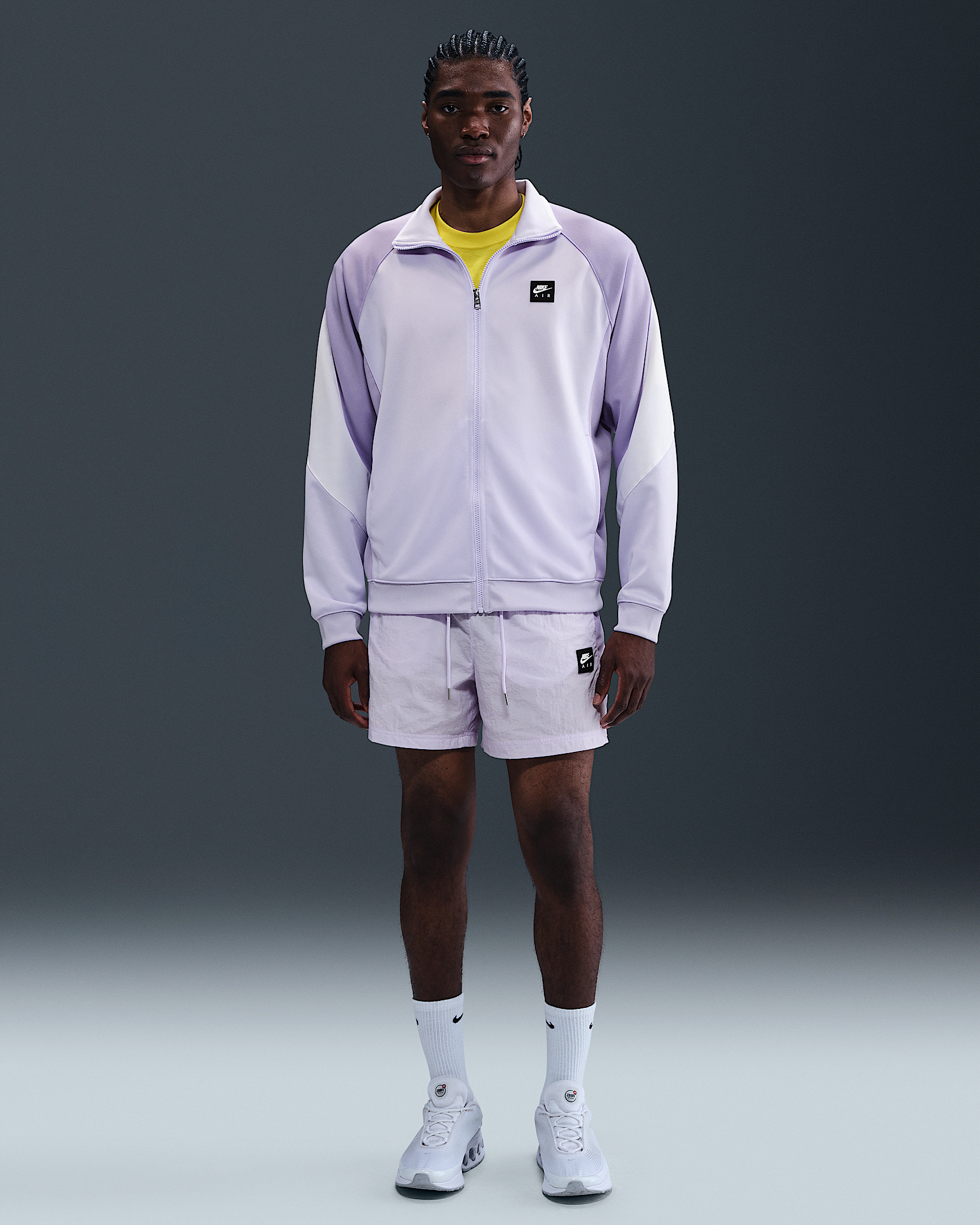 Embrace casual comfort with these premium sport-inspired shorts. The relaxed, above-the-knee cut is crafted with a thick, water-resistant material. Benefits - Standard fit feels relaxed through the seat and thighs for a casual fit. - An elastic waistband and internal drawcord deliver a comfortable, custom fit. Product Details - Nike Air flag label and silicone patch - Metal grommets and drawcord tips - Body: 100% nylon. Panels: 100% polyester. Lining: 100% polyester. - Machine wash - Imported - Shown: Amethyst Tint/Hydrangeas/Black - Style: HJ0662-538 SIZE & FIT Model is wearing size M and is 6′2″188cm Loose fit: roomy and relaxed