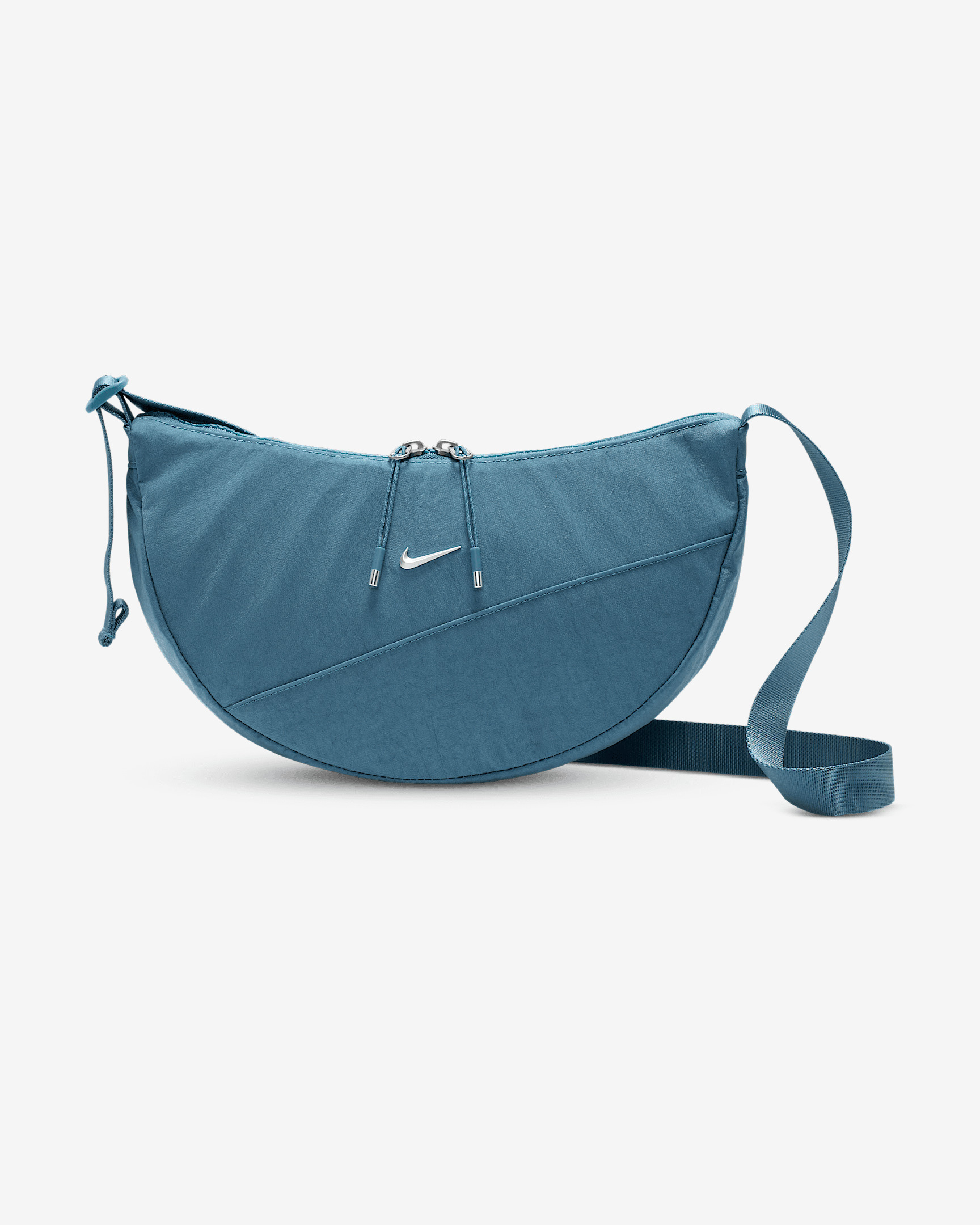 Keep your essentials close and your style game on point with the Nike Aura crossbody bag. The main pocket provides quick access to small items while interior slip pockets make organization easy. Product Details - 12" W x 7" H x 4" D - Adjustable strap - Body: 100% nylon. Lining: 100% polyester. - Spot clean - Imported - Shown: Smokey Blue/Smokey Blue/Matte Silver - Style: HQ4370-006