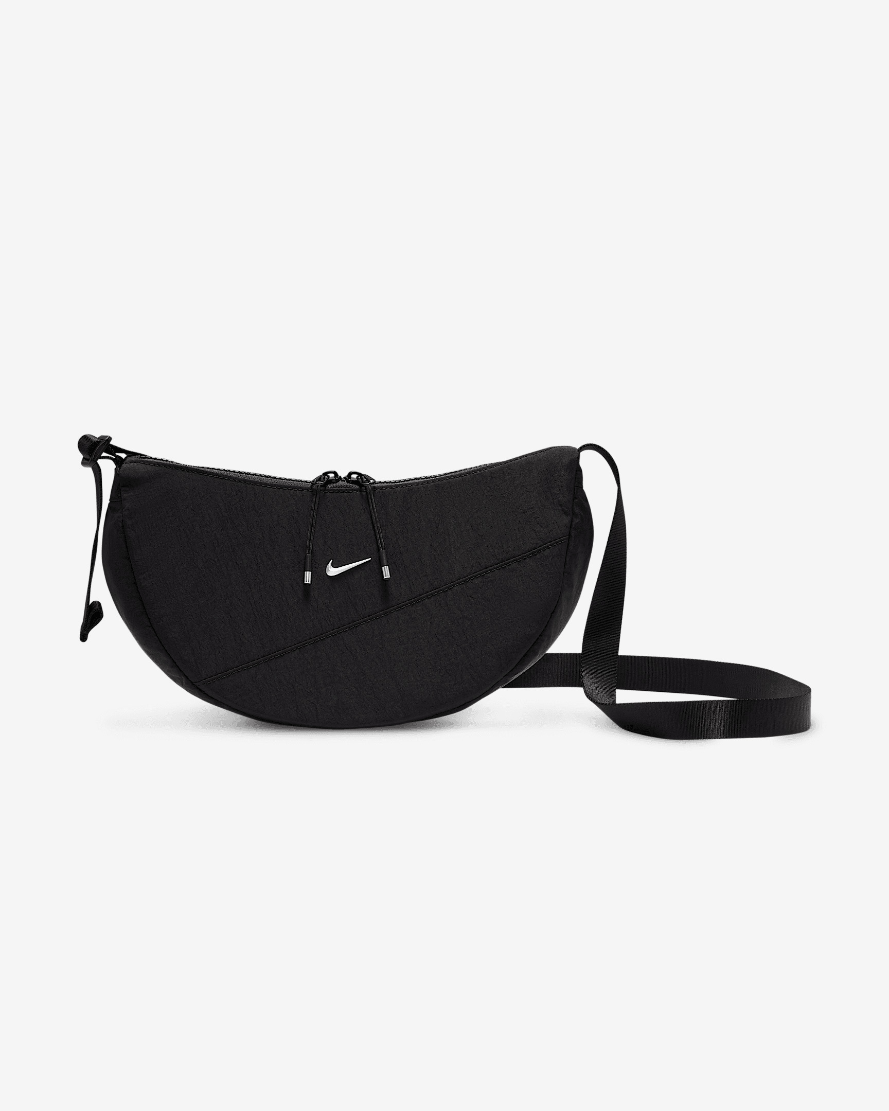 Keep your essentials close and your style game on point with the Nike Aura crossbody bag. The main pocket provides quick access to small items while interior slip pockets make organization easy. Product Details - 12" W x 7" H x 4" D - Adjustable strap - Body: 100% nylon. Lining: 100% polyester. - Spot clean - Imported - Shown: Black/Black/Matte Silver - Style: HQ4370-010