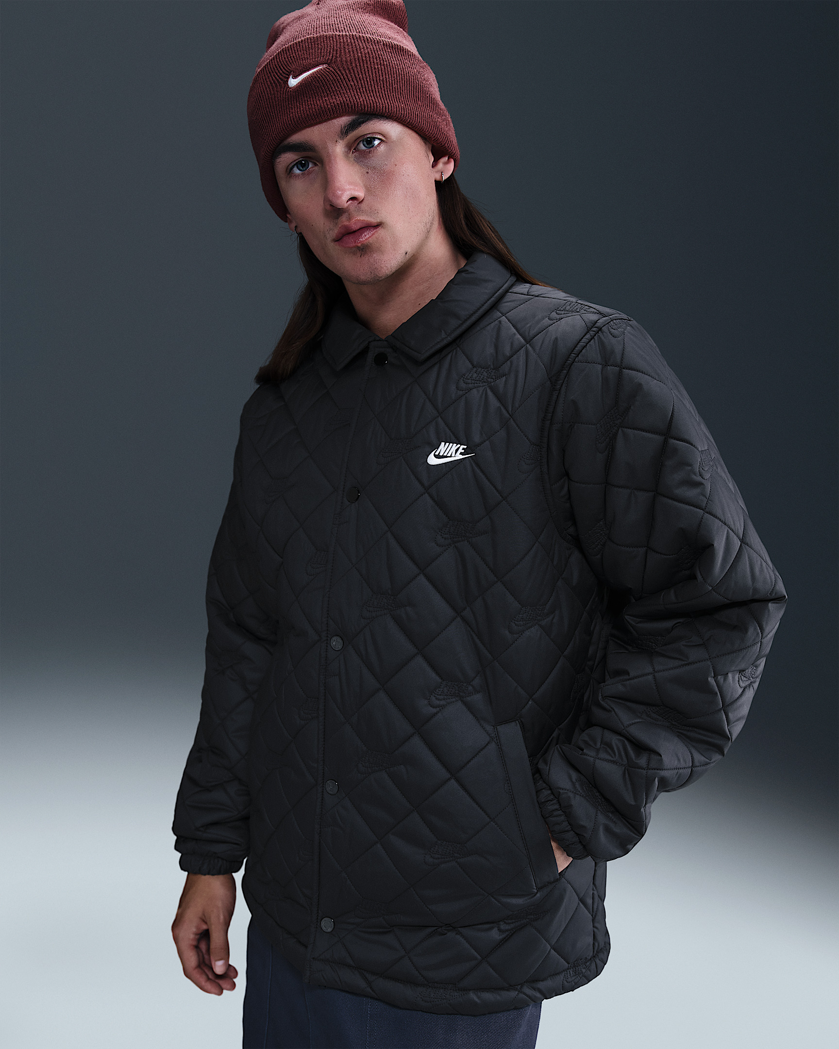 This classic, cool-weather jacket is constructed with quilted woven fabric and Therma-FIT technology. The interior has a smooth lining that adds both comfort and a pop of Nike Club branding. Benefits - Nike Therma-FIT technology helps manage your body’s natural heat to help keep you warm in cold-weather conditions. - The loose fit feels roomy through the body for easy movement and layering. - A bungee with drawcord at the waist lets you switch up the fit. - Lightweight synthetic insulation helps keep you warm in cool conditions. Product Details - Embroidered Nike Futura logo - Snap button front - Body: 100% polyester. Lining: 100% polyester. Fill: 100% polyester. - Machine wash - Imported - Shown: Black/White - Style: HV1377-010 SIZE & FIT Loose fit: roomy and relaxed