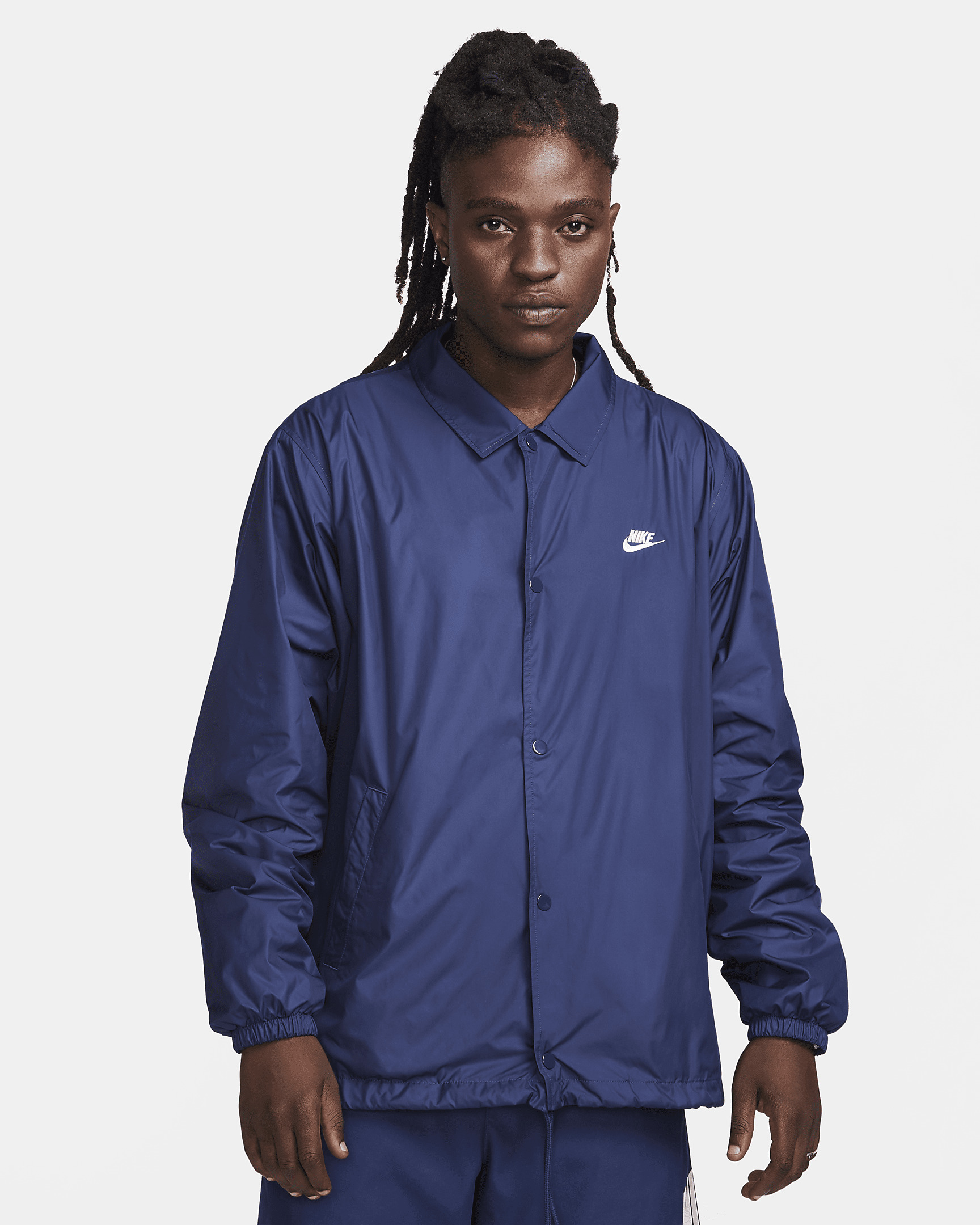 Keep your look clean and classic in this coach's jacket from our Nike Club collection. Roomy through the body and sleeves, the relaxed fit is paired with smooth woven fabric and soft cotton lining to bring casual comfort to any outfit. Pair it up with some retro Nike sneakers for a stylish look that works just about anywhere. Benefits - Smooth woven fabric feels crisp and lightweight. - Cotton jersey lining feels soft and comfy. - Designed to feel roomy through the body for easy movement and layering. Product Details - Snap closure - Spread collar - Hand pockets - Drawcord hem - Embroidered Nike Futura logo at left chest - Body: 100% polyester. Lining: 100% cotton. - Machine wash - Imported - Shown: Midnight Navy/White - Style: FN3316-410 SIZE & FIT Model is wearing size M and is 6′0″183cm Big & Tall model is wearing size 3XL and is 6'5"196cm Loose fit: roomy and relaxed Fits large; we recommend ordering a size down