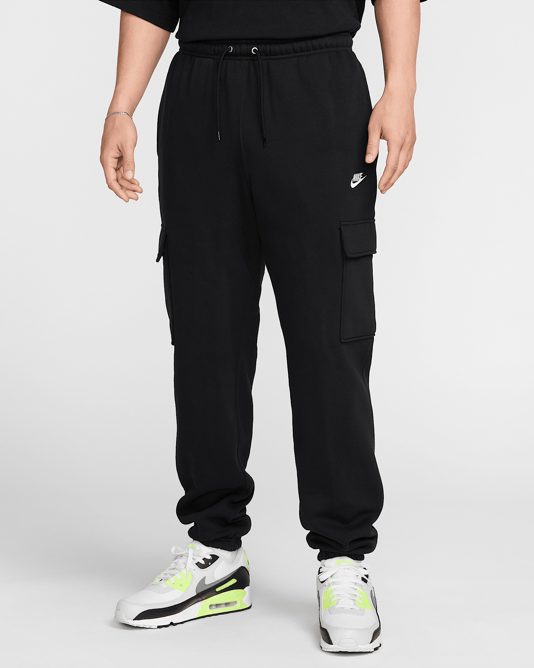 Clean meets casual with these brushed fleece cargo pants. Smooth on the outside, super soft on the inside, they deliver comfort you can count on. Benefits - The standard fit feels relaxed through the seat and thighs. - The snap closure back welt pocket and hand pockets fit most phones. Product Details - Embroidered Nike Futura logo - Elastic waistband and round drawcord - Body: 67-81% cotton/19-33% polyester. Side pocket knuckle side: 100% cotton. Back pocket: 100% cotton. - Material percentages may vary. Check label for actual content. - Machine wash - Imported - Shown: Black/Black/White - Style: FN3805-010 SIZE & FIT Model is wearing size M and is 5′11″180cm Big & Tall model is wearing size 3XL and is 6'5"196cm Standard fit: easy and traditional