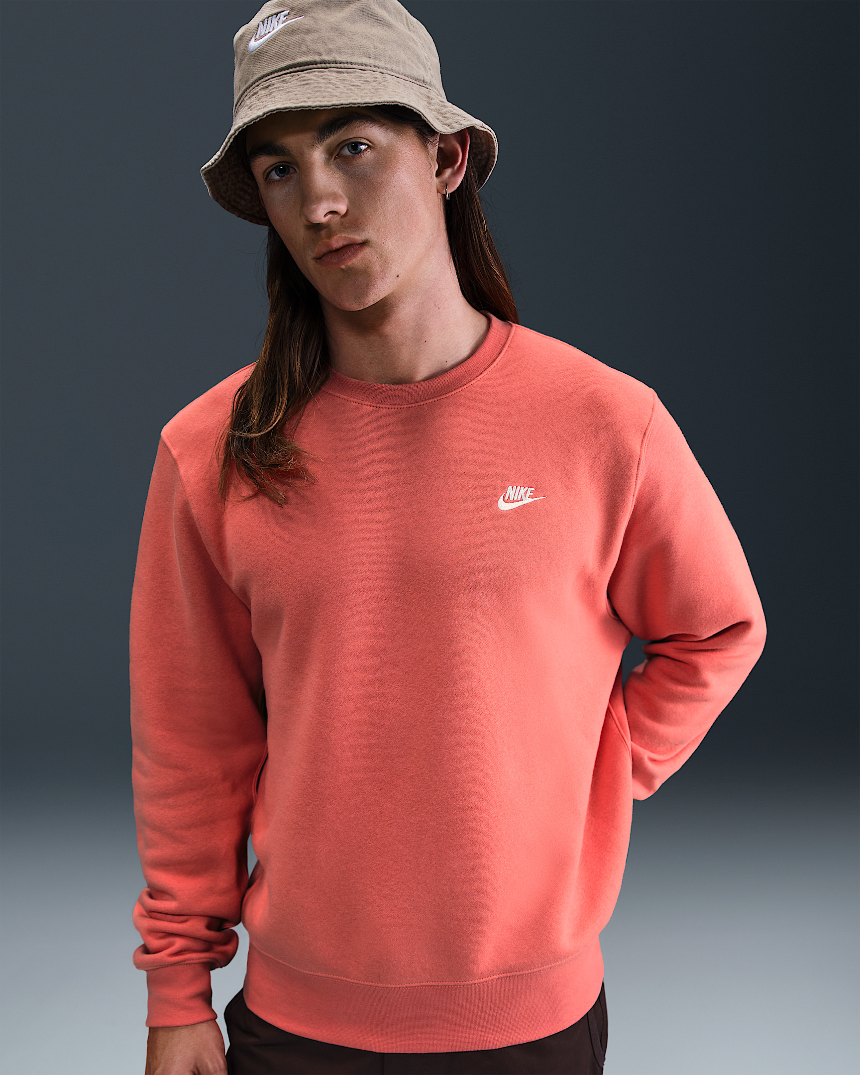 Clean meets casual with this classic crew. Our midweight brushed fleece feels extra soft on the inside and smooth on the outside, helping you stay cozy while keeping its structured shape. Product Details - Embroidered Nike Futura logo - Ribbed cuffs and hem - 67-80% cotton/20-33% polyester. - Material percentages may vary. Check label for actual content. - Machine wash - Imported - Shown: Magic Ember/White - Style: FN3886-814 SIZE & FIT Model is wearing size M and is 6′1″185cm Standard fit: easy and traditional