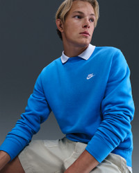 Clean meets casual with this classic crew. Our midweight brushed fleece feels extra soft on the inside and smooth on the outside, helping you stay cozy while keeping its structured shape. Product Details - Embroidered Nike Futura logo - Ribbed cuffs and hem - 67-80% cotton/20-33% polyester. - Material percentages may vary. Check label for actual content. - Machine wash - Imported - Shown: Light Photo Blue/White - Style: FN3886-435 SIZE & FIT Standard fit: easy and traditional