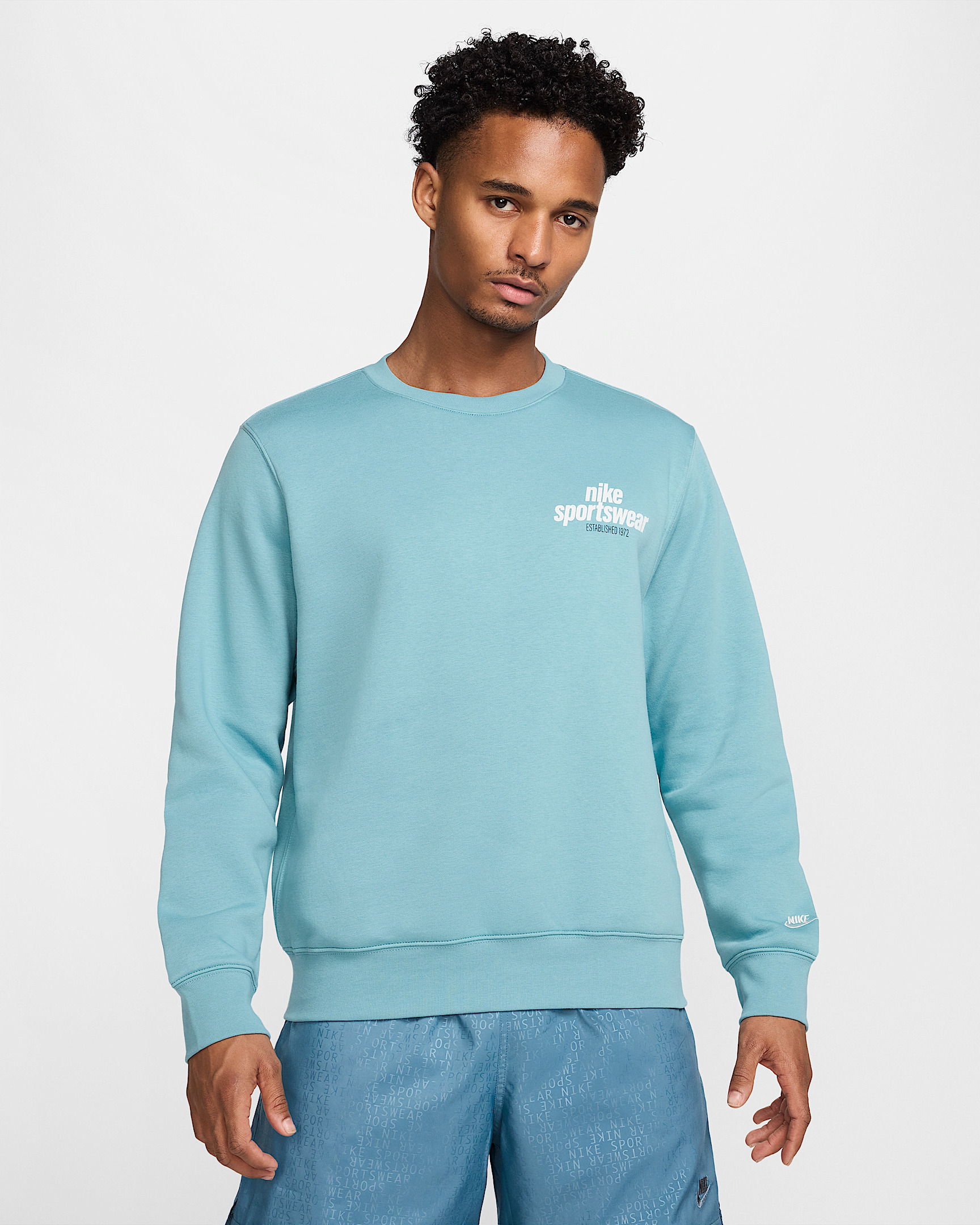 Clean meets casual with this classic crew. Smooth on the outside, super soft on the inside, it delivers comfort you can count on. Benefits - Our midweight brushed fleece feels extra soft on the inside and smooth on the outside, helping you stay cozy while keeping its structured shape. - The standard fit is designed to feel relaxed through the body for easy layering. Product Details - Embroidered Nike Futura logo - 80% cotton/20% polyester - Machine wash - Imported - Shown: Denim Turquoise/Photon Dust - Style: HJ2173-464 SIZE & FIT Model is wearing size M and is 6′2″188cm Big & Tall model is wearing size 3XL and is 6'5"196cm Standard fit: easy and traditional