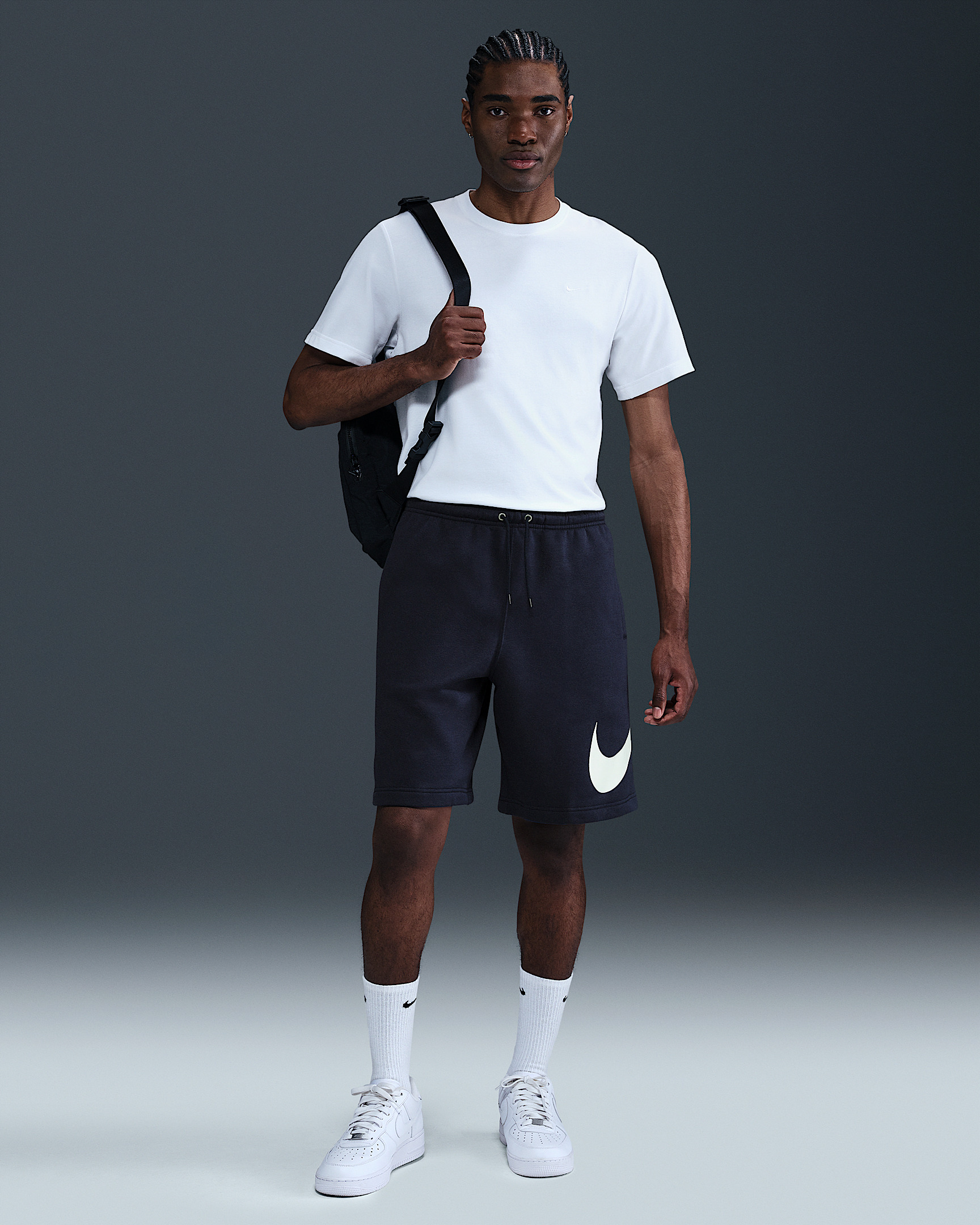 Clean meets casual with these classic shorts. Our midweight brushed fleece feels extra soft on the inside and smooth on the outside. Benefits - The standard fit feels relaxed through the seat and thighs. - An elastic waistband and external drawcord deliver a comfortable, custom fit at your waist. - A back pocket and hand pockets fit most phones. Product Details - Mid-thigh length - Body: 80-81% cotton/19-20% polyester. Side pocket knuckle side/Back pocket: 100% cotton. - Machine wash - Imported - Shown: Obsidian/Obsidian/White - Style: FN3906-451 SIZE & FIT Model is wearing size M and is 6′2″188cm Standard fit: easy and traditional