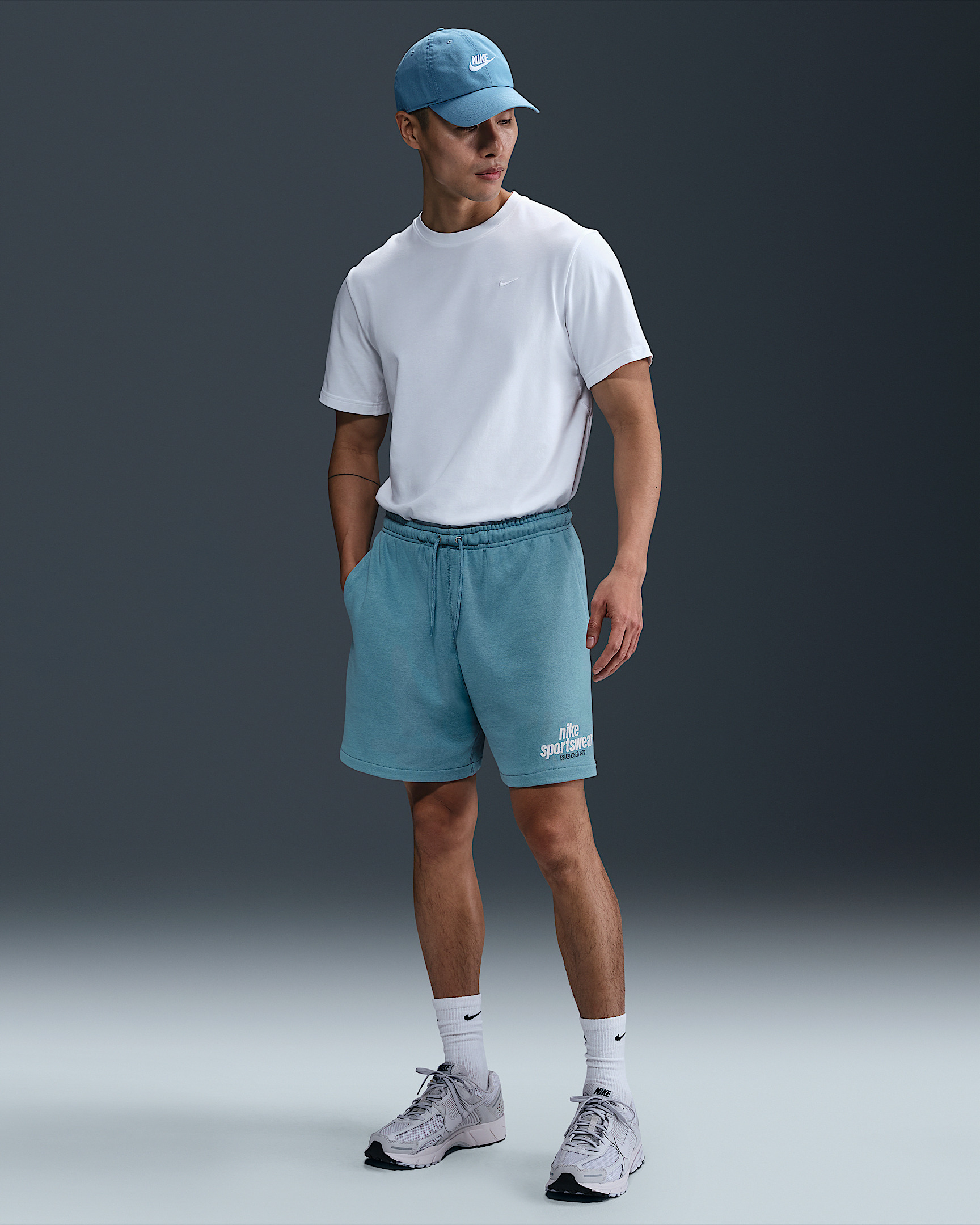 Go with the flow in these classic loopback-French terry shorts. They're designed to hit above the knee, with a relaxed fit through the seat and thighs. Benefits - Smooth on the outside with unbrushed loops on the inside, this midweight French terry helps create breathability, so it’s comfy enough for you to wear all year long, no matter the temp. - A snap secure back pocket and hand pockets fit most phones. Product Details - Embroidered Nike Futura logo - Mid-thigh length - Elastic waistband with round braided drawcord - Body: 80% cotton/20% polyester. Side pocket knuckle side/Back pocket. 100% cotton. - Machine wash - Imported - Shown: Denim Turquoise/Denim Turquoise/Photon Dust - Style: HJ2677-464 SIZE & FIT Model is wearing size M and is 6′1″185cm Standard fit: easy and traditional