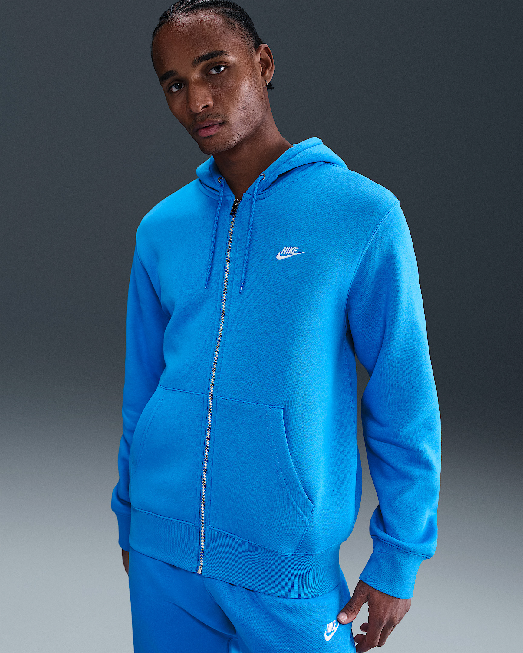 Clean meets casual with this classic hoodie. Smooth on the outside, super soft on the inside, this brushed fleece sweatshirt delivers comfort you can count on. Benefits - Our midweight brushed fleece feels extra soft on the inside and smooth on the outside, helping you stay cozy while keeping its structured shape. - The standard fit is designed to feel relaxed through the body for easy layering. - Double-layer hood has a round braided drawcord to make finding the right fit a cinch. Product Details - Embroidered Nike Futura Logo - Divided pouch pocket - Ribbed hem and cuffs - Metal Zipper - Body: 67-80% cotton/20-33% polyester. Hood lining: 67-80% cotton/20-33% polyester. - Material percentages may vary. Check label for actual content. - Machine wash - Imported - Shown: Light Photo Blue/Light Photo Blue/White - Style: FN3861-435 SIZE & FIT Model is wearing size M and is 6′1″185cm Standard fit: easy and traditional