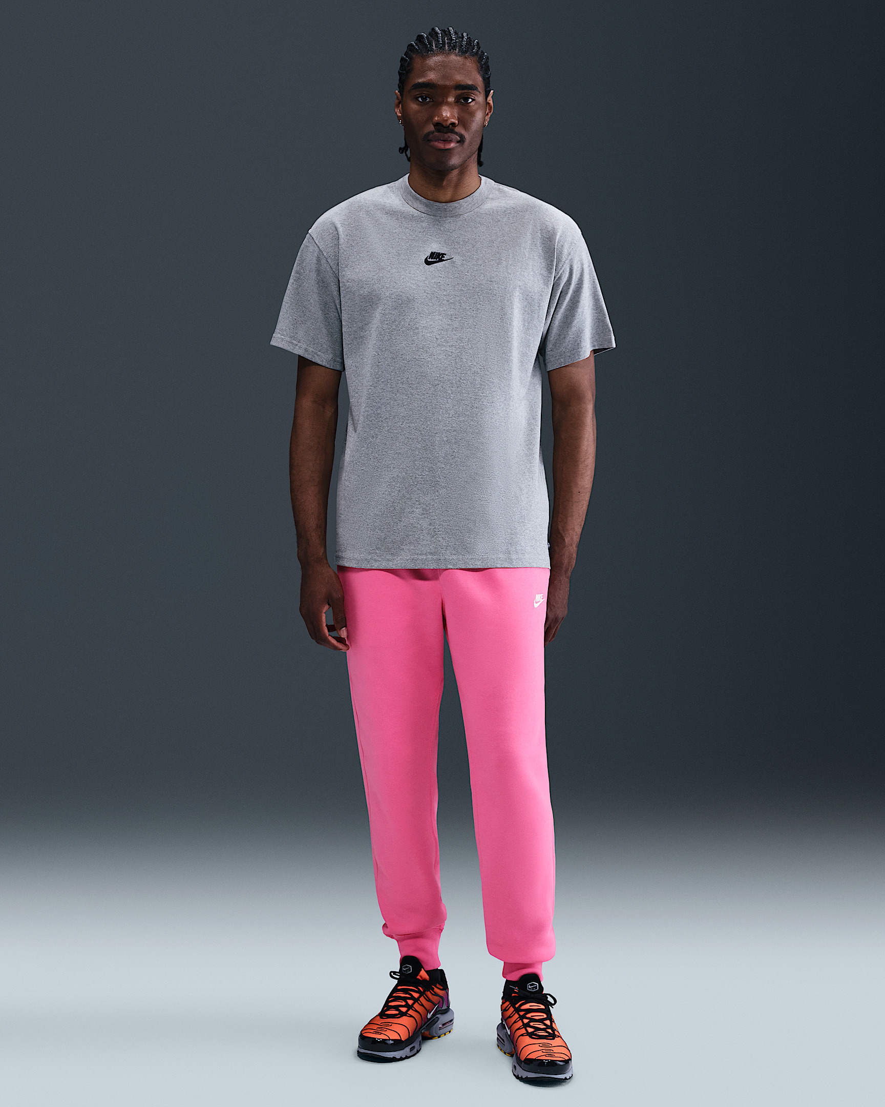 Clean meets casual with these classic joggers. Our midweight brushed fleece feels extra soft on the inside and smooth on the outside. Benefits - Their standard fit feels relaxed through the seat and thighs and tapers towards the ankle. - An elastic waistband and external drawcord deliver a comfortable, custom fit at your waist. - The snap closure back welt pocket and hand pockets fit most phones. Product Details - Embroidered Nike Futura logo - Body: 67-81% cotton/19-33% polyester. Side pocket knuckle side/Back pocket: 100% cotton. - Material percentages may vary. Check label for actual content. - Machine wash - Imported - Shown: Pinksicle/Pinksicle/White - Style: FN3787-684 SIZE & FIT Model is wearing size M and is 6′3″189cm Standard fit: easy and traditional