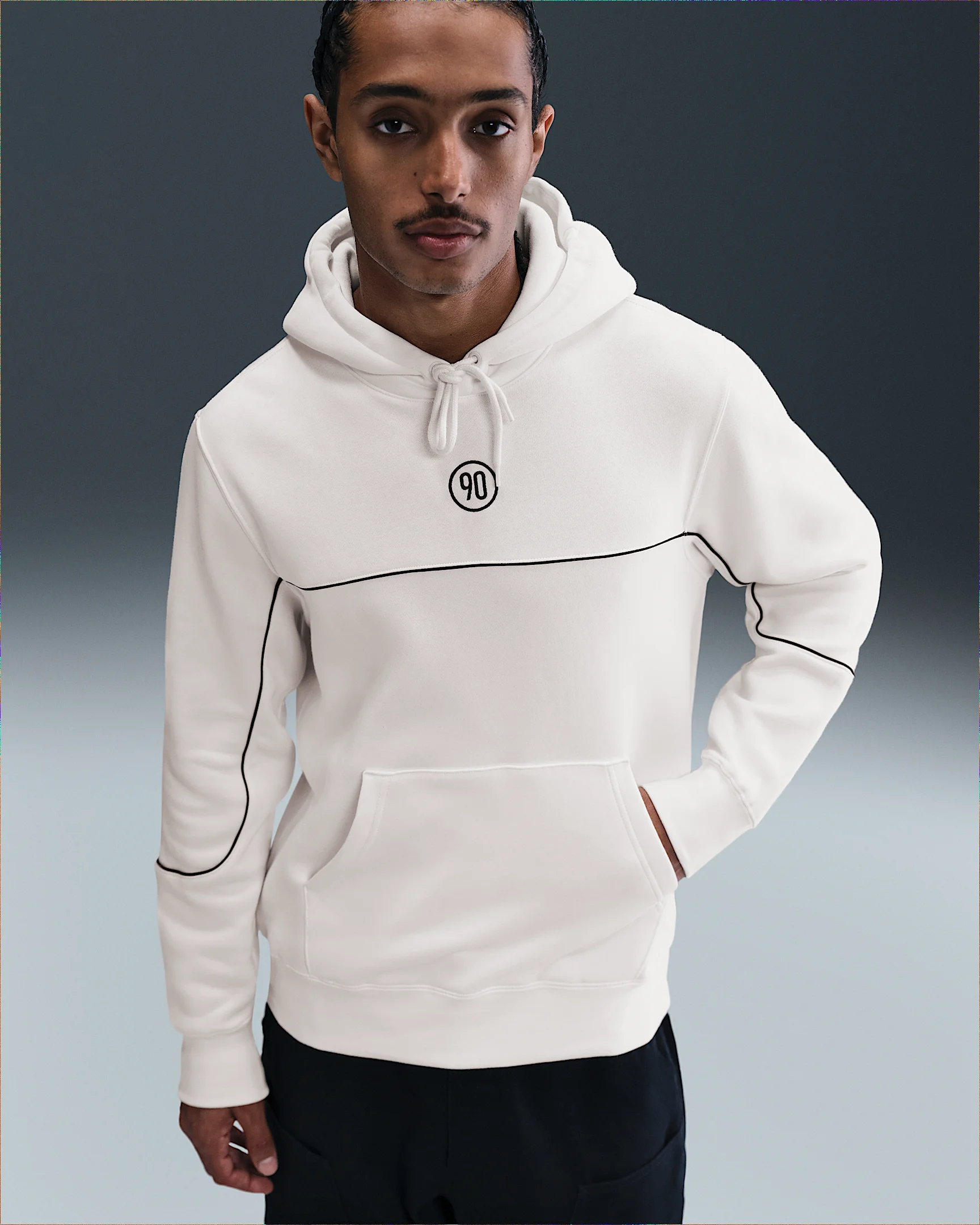 This Total 90 hoodie uses curving design lines and cozy fleece to create a 2000s inspired staple for soccer fans everywhere. Product Details - Front pocket - Ribbed cuffs and hem - Embroidered details - 80% cotton/20% polyester - Machine wash - Imported - Shown: Sail/Black/Black - Style: HV3509-133 SIZE & FIT Standard fit: easy and traditional