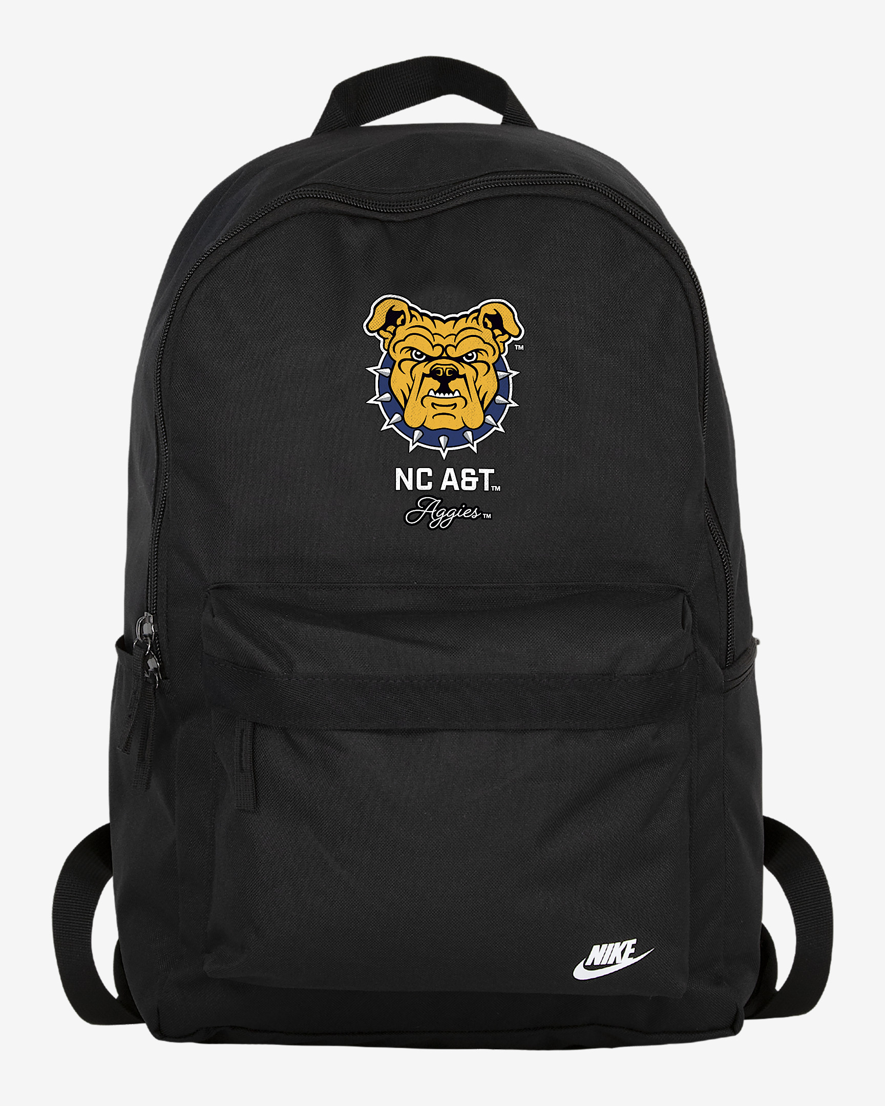 Show your Aggies pride with the Nike Heritage Backpack. Its spacious main compartment features a sleeve that holds up to a 15" laptop, so your computer is never out of reach. Two zippered accessories pockets help keep your gear organized and easy to grab. Benefits - This style celebrates and commemorates an institution enacting positive change for the next generation of scholars, athletes and leaders of society, specifically those attending Historically Black Colleges and Universities (HBCUs). - The shoulder straps and back are padded for extra comfort. Product Details - 100% polyester - 25L - 17" H x 12" W x 6" D - Spot clean - Imported - Shown: Black - Style: A11956NCAT25-BLK
