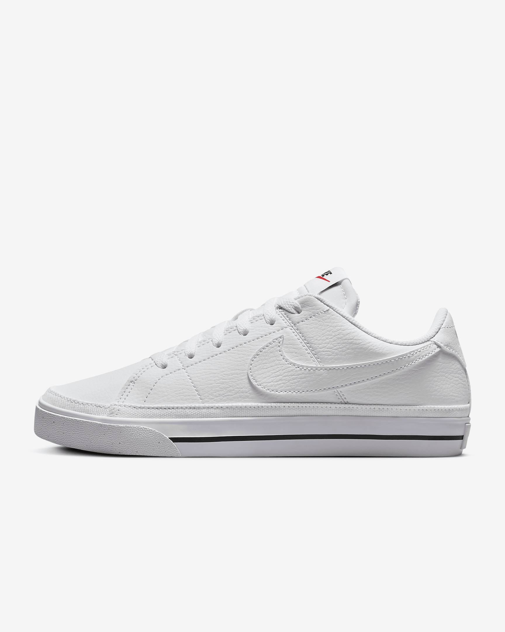 Honoring a history rooted in tennis culture, the Nike Court Legacy Next Nature brings you a time-tested staple in a design that's made from at least 20% recycled materials by weight. Its synthetic leather and retro design let you blend sport and fashion. Do good by looking good. Benefits - Whenever you see the Nike Sunburst or the name Next Nature (NN), you see one more step on our journey toward zero carbon and zero waste. - Synthetic leather gives you high-quality durability and comfort. - Full-length rubber outsole with herringbone pattern delivers multi-surface traction. Product Details - Canvas trim - Padded collar - Shown: White/Black/Volt/White - Style: DH3161-101 SIZE & FIT Fits small; we recommend ordering a half size up