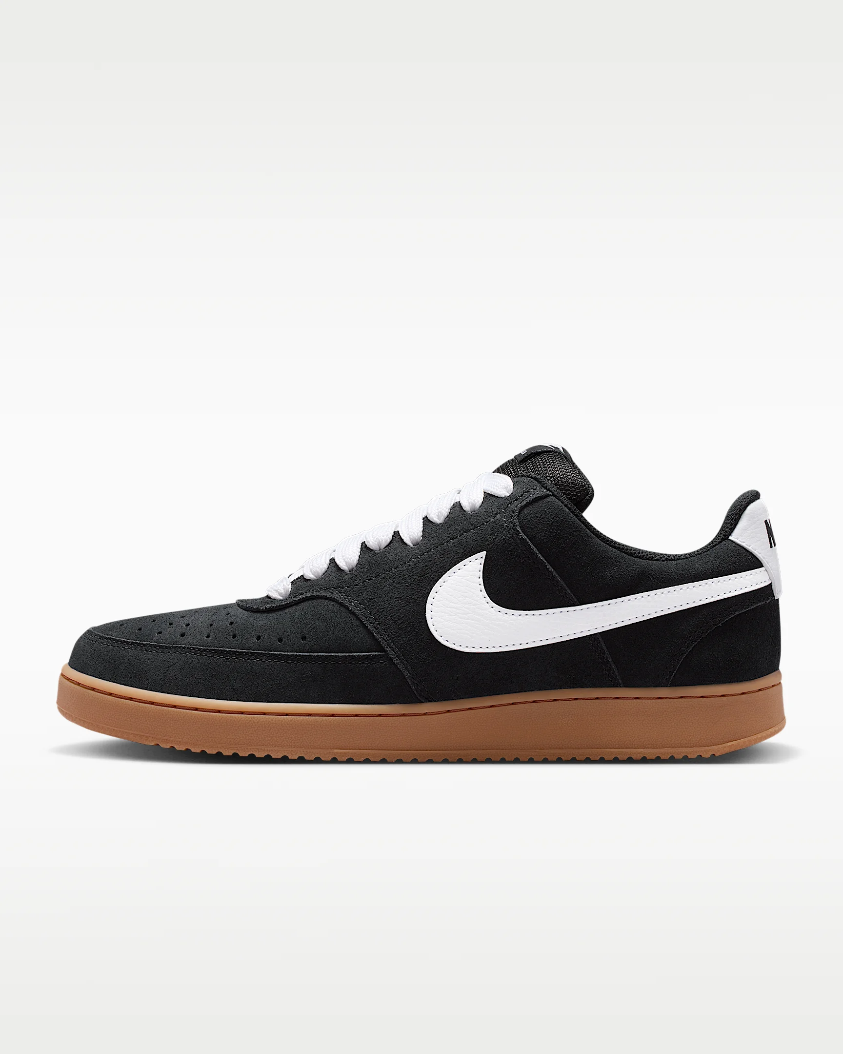In love with the old-school style of '80s basketball? Meet the Court Vision. It combines an all-leather look with a rubber cupsole, bringing you all-day comfort inspired by some of the most iconic silhouettes of the past. Benefits - Perforations at the toe box and sides add breathability. - Rubber cupsole provides durability and traction. Product Details - Shown: Black/Gum Medium Brown/White - Style: IR1832-001