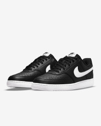 In love with the classic look of '80s basketball but have a thing for the fast-paced culture of today's game? Meet the Nike Court Vision Low. A classic remixed with at least 20% recycled materials by weight, its crisp upper and stitched overlays keep the soul of the original style. The plush, low-cut collar keeps it sleek and comfortable for your world. Benefits - Made with at least 20% recycled material by weight. - Whenever you see the Nike Sunburst or the name Next Nature (NN), you see one more step on our journey toward zero carbon and zero waste. - Using synthetic materials, the design features materials that echo mid-1980s basketball shoes. - Padded, low-cut collar looks sleek and feels great while the perforations on the toe and sides add comfort and breathability. Product Details - Perforations on the toe and sides - Rubber outsole - Shown: Black/Black/White - Style: DH2987-001 SIZE & FIT Fits large; we recommend ordering a half size down