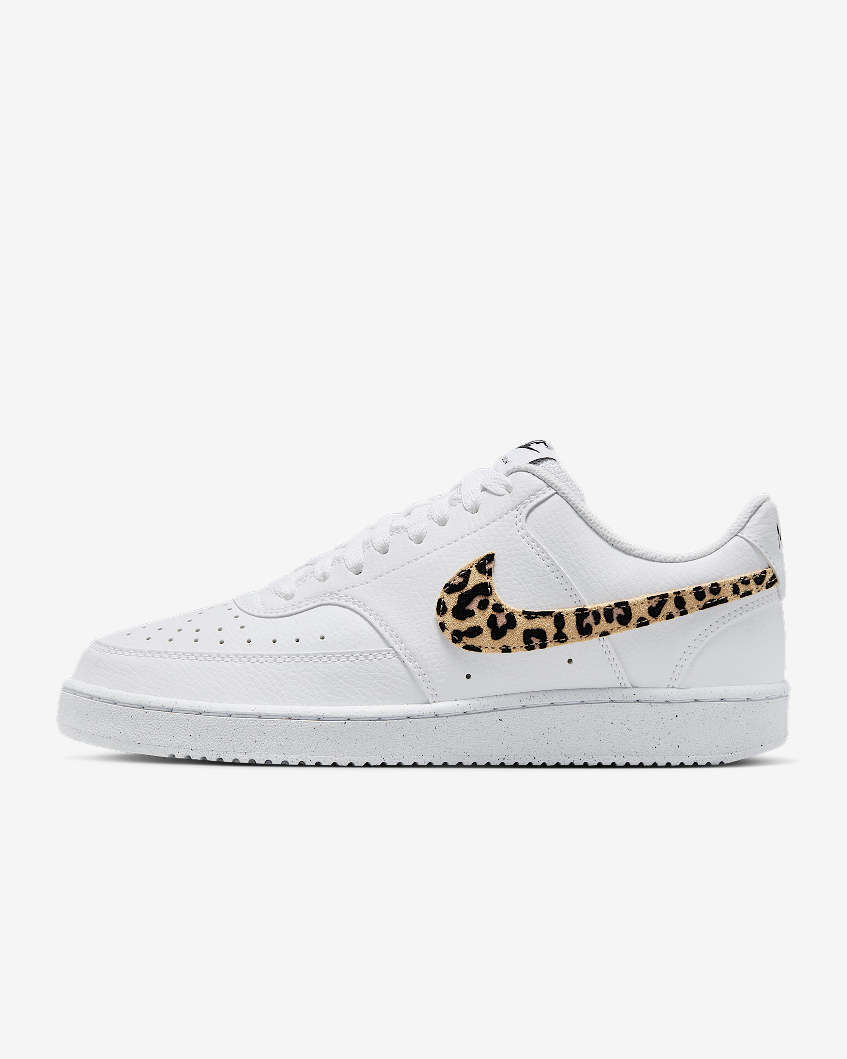 The fastbreak style of '80s basketball meets your everyday with the Nike Court Vision Low. It features an upper inspired by old-school basketball sneakers and the classic rubber cupsole featured on some of the most iconic silhouettes of the past. This version is finished with a suede, leopard-print Swoosh logo for a fierce look. Benefits - Leather upper with perforated toe box is breathable and comfortable. - Rubber cupsole adds durability, support and traction. Product Details - Low-cut silhouette - Padded collar - Shown: White/Black/Multi-Color - Style: IM7646-100