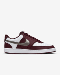 The fastbreak style of '80s basketball meets your everyday with the Nike Court Vision Low. It features an upper inspired by old-school basketball sneakers and the classic rubber cupsole featured on some of the most iconic silhouettes of the past. This version is finished with a metallic Swoosh logo to make your look shine. Benefits - Leather upper with perforated toe box is breathable and comfortable. - Rubber cupsole adds durability, support and traction. Product Details - Low-cut silhouette - Padded collar - Shown: White/Burgundy Crush/Metallic Pewter - Style: IM7647-100