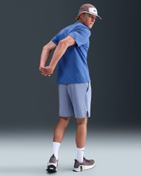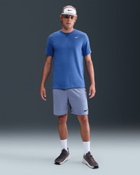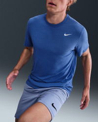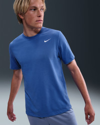 The Nike Dri-FIT T-Shirt delivers a soft feel, sweat-wicking performance and a great range of motion to get you through your workout in total comfort. Benefits - Dri-FIT technology helps keep you dry and comfortable. - Small Swoosh design appears on the left chest. Product Details - Standard fit for a relaxed, easy feel - Fabric: 57-60% cotton/40-43% polyester - Machine wash - Imported - Note: Material percentages may vary slightly depending on color. Check label for actual content. - Shown: Comet Blue/White - Style: AR6029-411 SIZE & FIT Standard fit: easy and traditional Fits large; we recommend ordering a size down