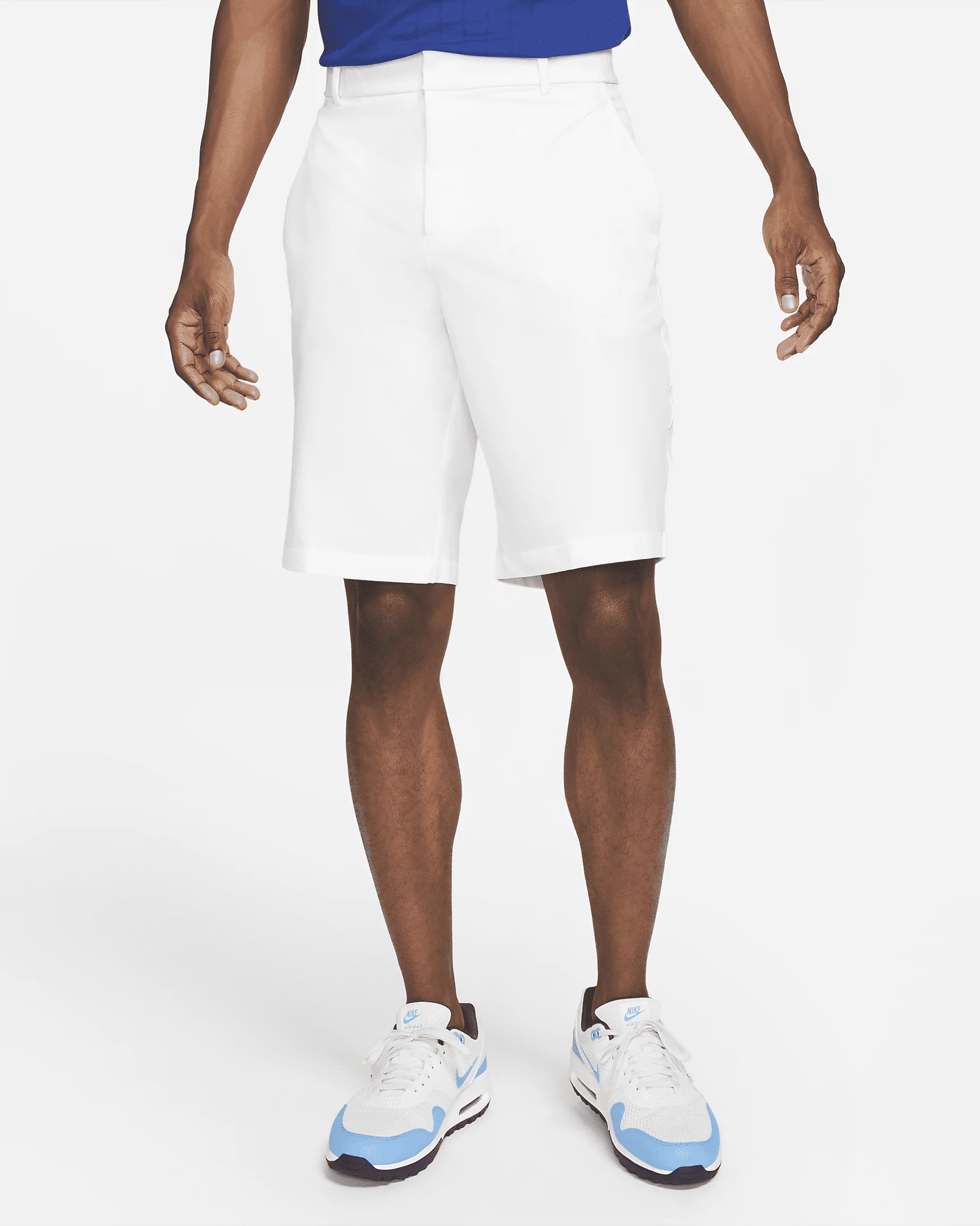 Move comfortably on and off the course in the Nike Dri-FIT Shorts. Stretchy fabric lets you line up your putts without restriction and a tacky waistband helps keep your shirt tucked in while you bend and swing. Benefits - Dri-FIT technology helps keep you dry and comfortable. - Stretchy woven fabric has a subtle texture on the inside to help keep the fabric from clinging to your skin. - Repeating "Nike Golf" graphic on the inner waistband has a slightly tacky texture to help secure a tucked-in shirt. - V-notch in the back of the waistband gives you extra stretch. Product Details - Standard fit for a relaxed, easy feel - Mesh-lined pockets - Snap-button closure - Zippered fly - Body: 89-90% polyester/10-11% spandex. Pocket bags: 100% polyester. - Material percentages may vary. Check label for actual content. - Machine wash - Imported - Shown: White/White - Style: CU9740-100 SIZE & FIT Standard fit: easy and traditional