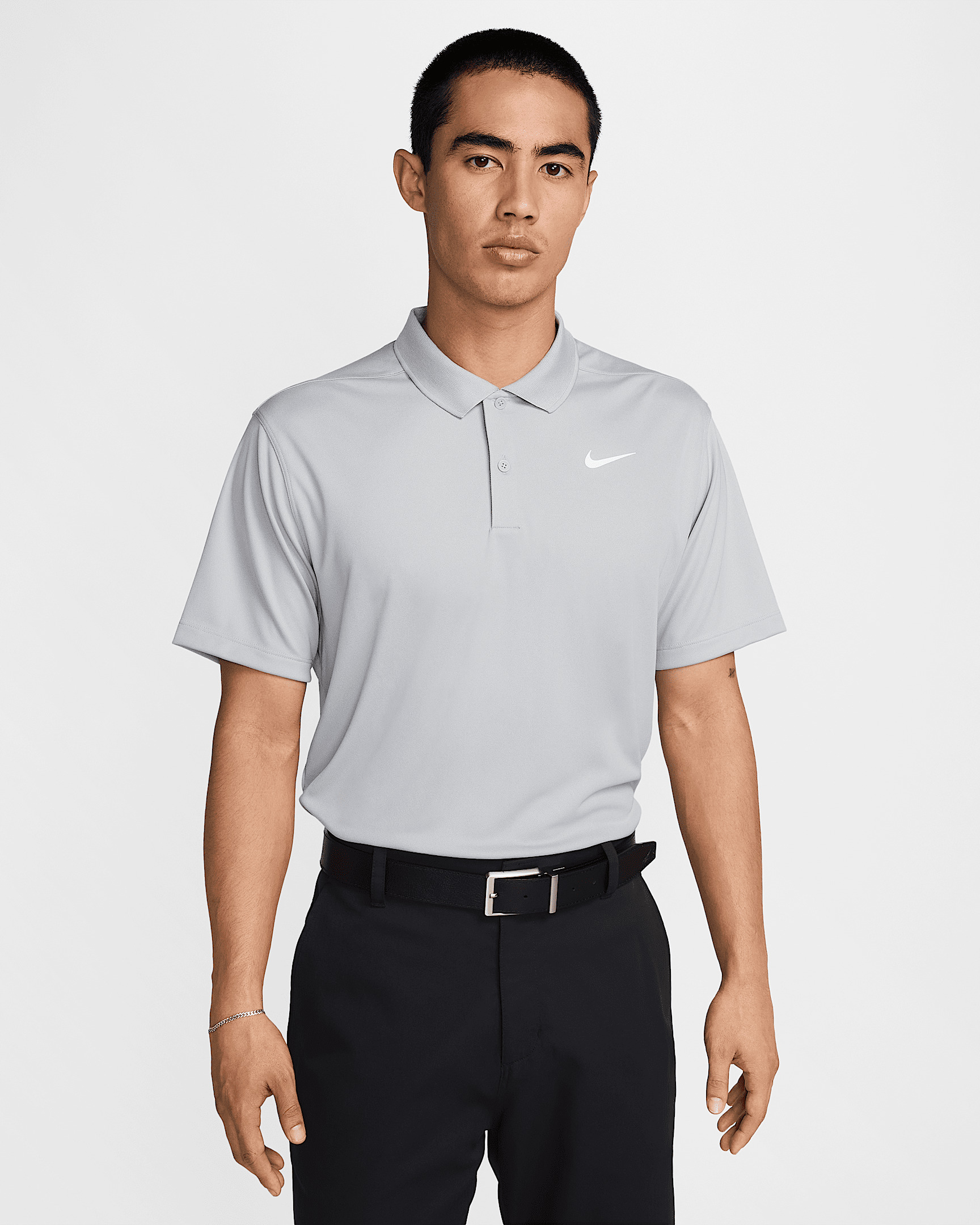 Crafted from breathable, sweat-wicking fabric, the Nike Dri-FIT Victory Polo puts a new spin on golf performance. This product is made with 100% recycled polyester fibers. Benefits - Nike Dri-FIT technology moves sweat away from your skin for quicker evaporation, helping you stay dry and comfortable. - Shoulder seams are rolled forward so you can fully power through your swing. - Collar is ribbed to help prevent curling. Product Details - Standard fit for a relaxed, easy feel - 2-button placket - 100% polyester - Machine wash - Imported - Shown: Wolf Grey/White - Style: DH0822-012 SIZE & FIT Model is wearing size M and is 5′11″180cm Standard fit: easy and traditional