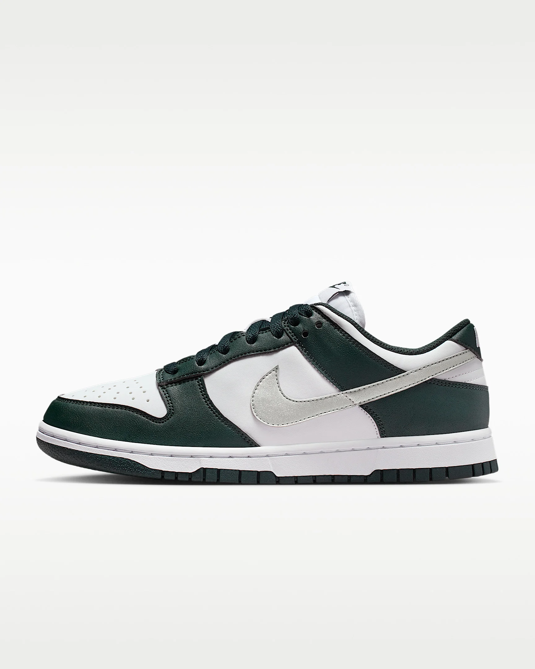 You can always count on a classic. This Dunk Low features a synthetic leather upper with a metallic Swoosh for a polished look. And like all Dunks, it has plush padding for game-changing comfort that lasts. Benefits - Synthetic leather upper provides a comfortable fit. - Foam midsole offers lightweight cushioning. - Rubber outsole with classic pivot circles adds durable traction and heritage style. Product Details - Low-cut silhouette - Padded collar - Foam midsole - Shown: Seaweed/White/Sail/Metallic Silver - Style: IO7450-364
