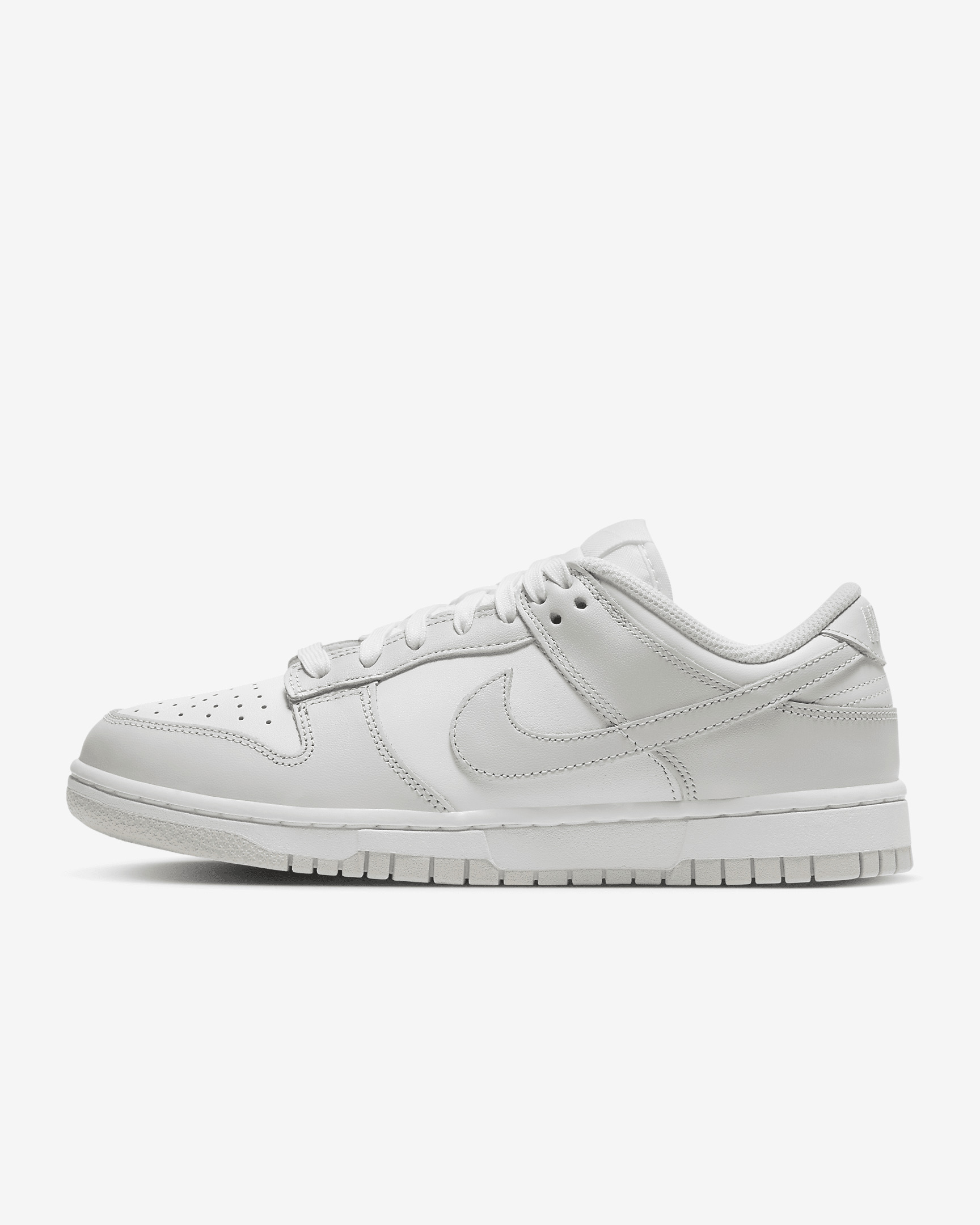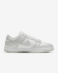 Created for the hardwood but taken to the streets, the '80s b-ball icon returns with perfectly shined overlays and classic team colors. With its iconic hoops design, the Nike Dunk Low channels '80s vintage back onto the streets while its padded, low-cut collar lets you take your game anywhere—in comfort. Benefits - The crisp leather on the upper has a slight sheen, ages to soft perfection and features durable overlays reminiscent of '80s b-ball. - The foam midsole offers lightweight, responsive cushioning. - The padded, low-cut collar adds a sleek look that feels comfortable. - The bold color-blocking on select versions returns to the university colors released in 1985, letting you choose who reigned supreme and rep your team. - The rubber sole with classic hoops pivot circle adds durability, tractions and heritage style. Product Details - Low-cut collar - Foam insole - Shown: White/White/Photon Dust - Style: DD1503-103