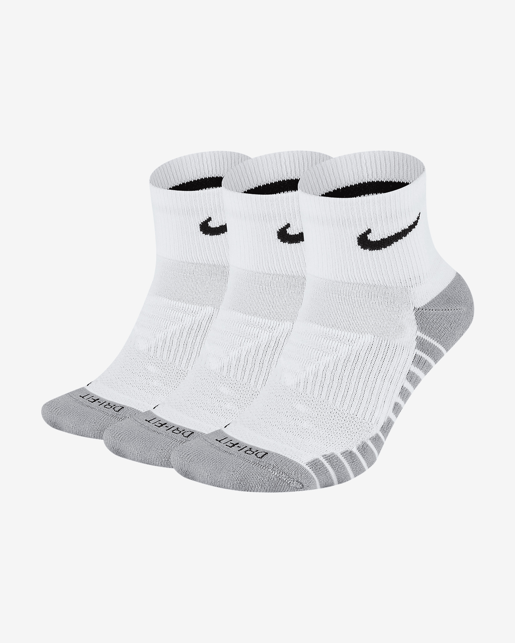Power through your workout with the Nike Everyday Max Cushioned Socks. The thick terry sole gives you extra comfort for foot drills and lifts while high-friction yarns in the footbed reduce slippage. Benefits - Dri-FIT technology helps keep your feet dry and comfortable. - Thick terry sole delivers comfort and impact cushioning. - High-friction yarn in the footbed helps reduce slippage. - Mesh fabric at the top of the foot offers ventilation. - 1/4-length silhouette provides medial coverage. - Anatomically correct left and right socks are designed for a natural fit. Product Details - 72% polyester/13% nylon/13% cotton/2% spandex - Machine wash - Imported - Shown: White/Wolf Grey/Black - Style: SX5549-100
