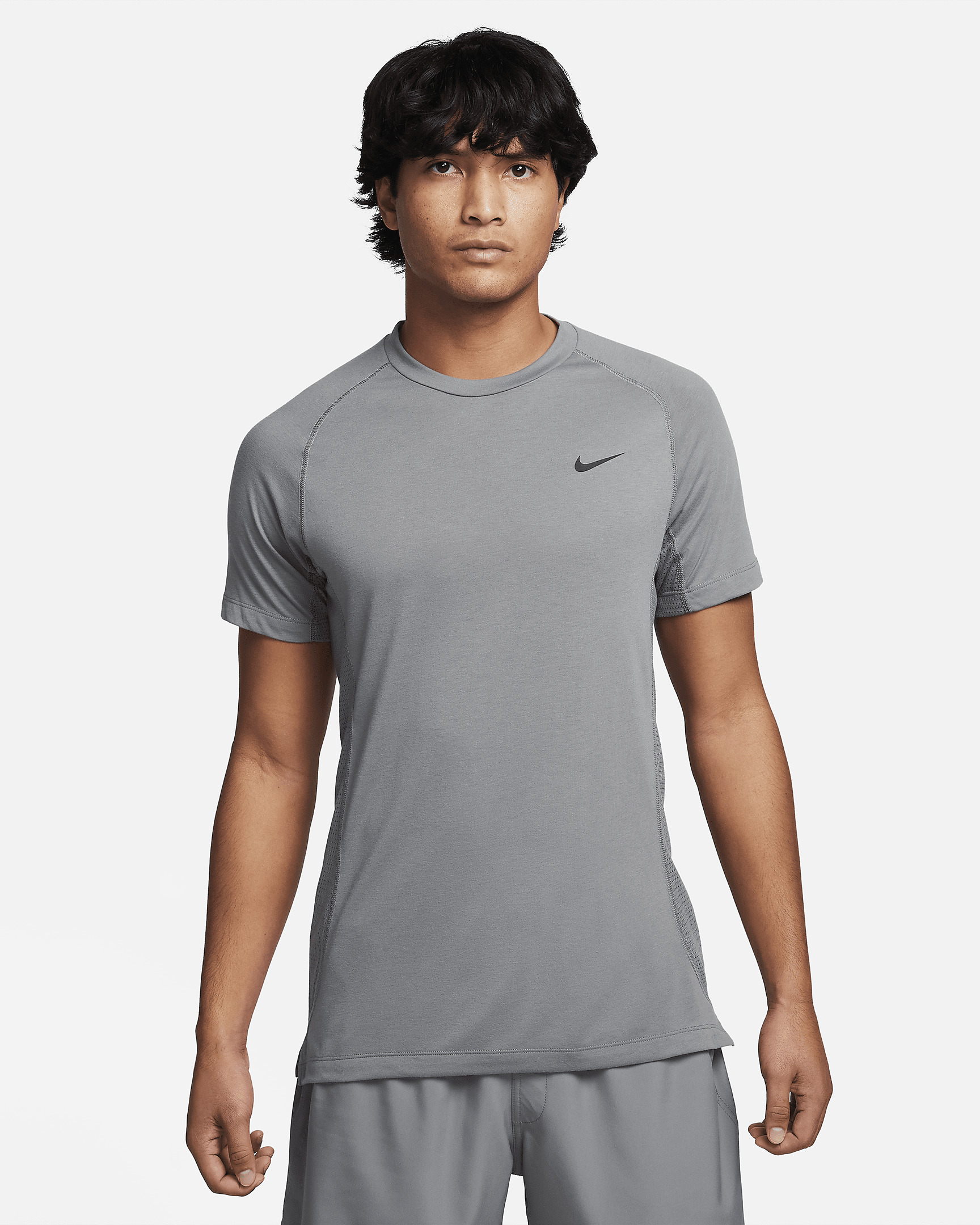 The Nike Flex Rep top is made to perform through your entire workout—from presses to lifts to stretches. A flexible, slim fit with reinforced seams stands up to the grind without getting in the way. Paired up with breathable underarm mesh, our sweat-wicking tech helps keep you cool and dry. Product Details - Side vents - Body: 85% polyester/15% cotton. Mesh: 87% polyester/13% cotton. - Machine wash - Imported - Shown: Smoke Grey/Black - Style: FN2979-084 SIZE & FIT Model is wearing size M and is 6′0″183cm Sm fit: sleek and tailored Fits small; we recommend ordering a size up