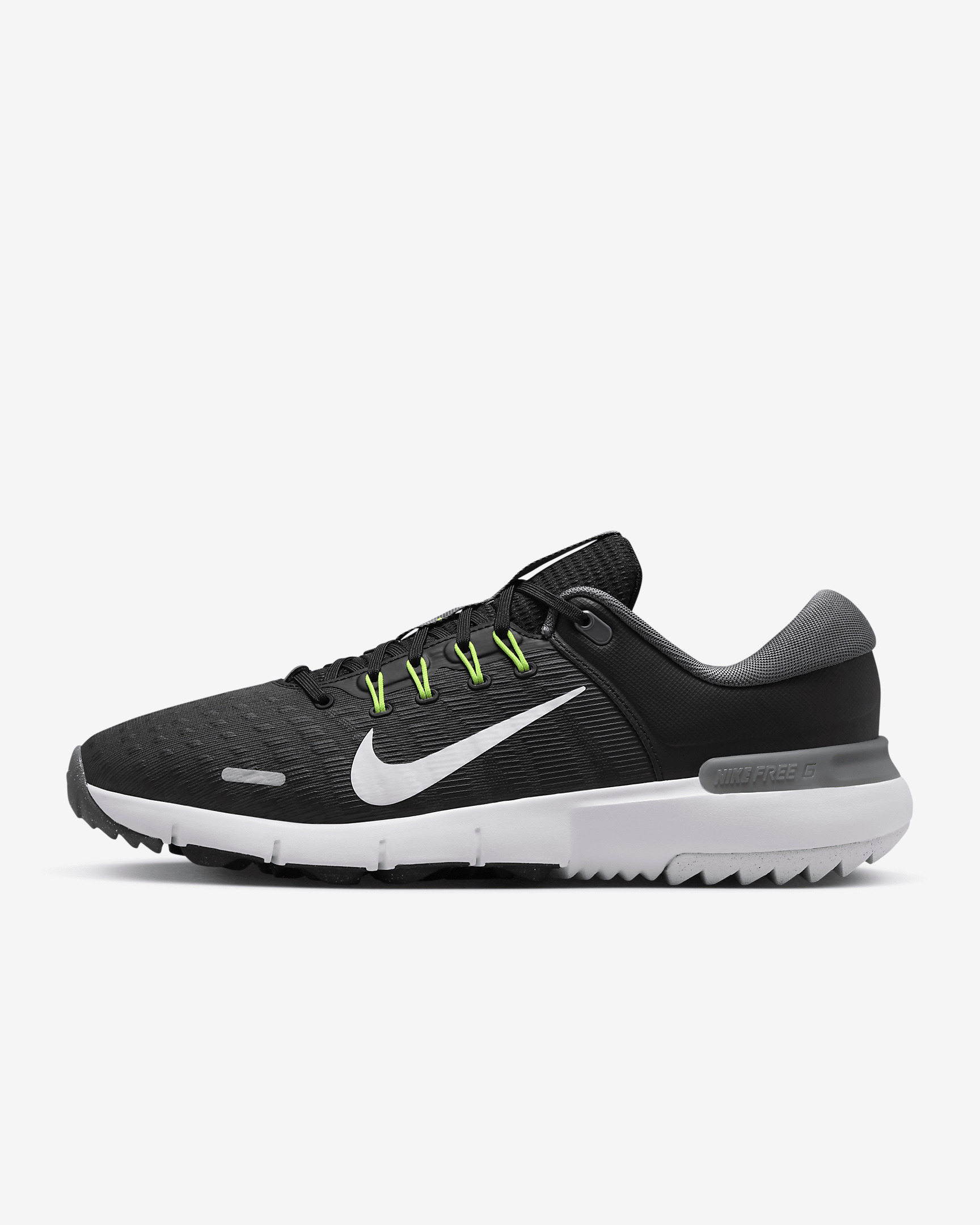 A blast from the past, the Nike Free Golf uses some of our favorite running footwear technology to make it even more functional than before. It's our lowest-to-the-ground golf shoe, offering freedom when you’re on the hoof or housing an approach shot from deep. More Benefits - Wet traction rubber pattern helps keep you upright when in wet conditions. - Tough plastic clip around the heel helps give you stability. Product Details - 1-year waterproof warranty - Cushioned insole - Reflective details - Not intended for use as Personal Protective Equipment (PPE) - Shown: Black/Iron Grey/Volt/White - Style: FN0332-001