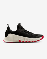 From power lifts to ladders, from grass blades to grainy platforms, from the turf to the track your workout has a certain purpose, a specific focus. The Free Metcon 6 supports every grunt, growl and “got it!” We added even more forefoot flexibility to our most adaptable trainer and reinforced the heel with extra foam. That means more freedom for dynamic movements during plyos and cardio classes, plus the stable base you need for weights. More Benefits - Multi-surface traction pattern is made for any workout surface and activity. - Comfortable inner sleeve increases ankle support and provides a more seamless fit. Product Details - Shown: Black/University Red/Sail - Style: FJ7127-006
