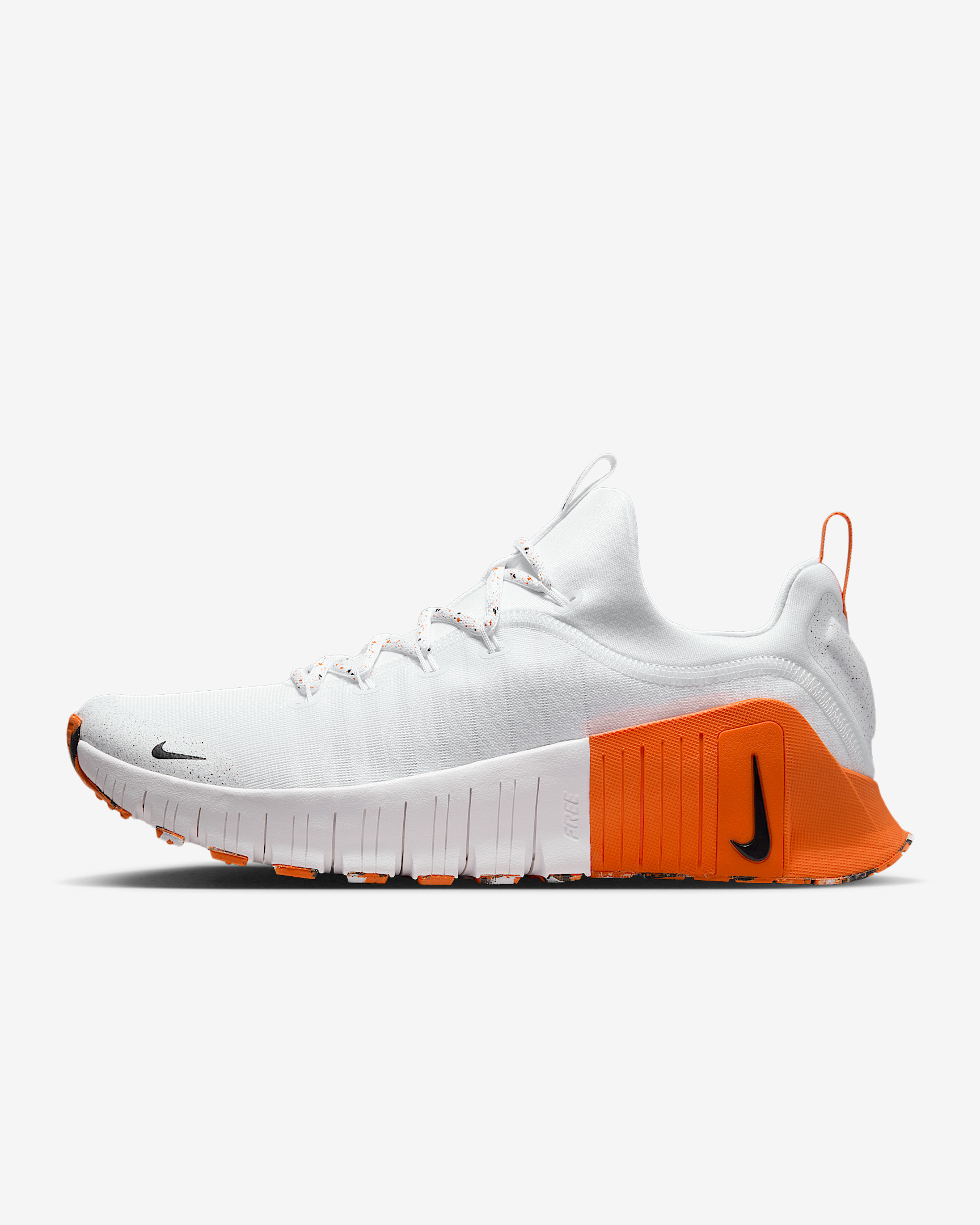 From power lifts to ladders, from grass blades to grainy platforms, from the turf to the track your workout has a certain purpose, a specific focus. The Free Metcon 6 supports every grunt, growl and “got it!” We added even more forefoot flexibility to our most adaptable trainer and reinforced the heel with extra foam. That means more freedom for dynamic movements during plyos and cardio classes, plus the stable base you need for weights. More Benefits - Multi-surface traction pattern is made for any workout surface and activity. - Comfortable inner sleeve increases ankle support and provides a more seamless fit. Product Details - Shown: White/Safety Orange/Black - Style: FJ7127-106