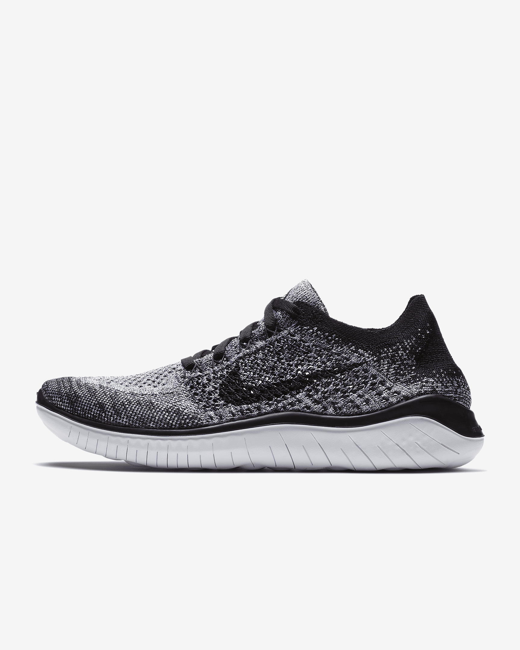 Made for short runs when you want a barefoot-like feel, the Nike Free Run 2018 feels super light and flexible. Its sock-like upper has more stretch yarns than previous versions, so it hugs your feet more than ever. The innovative sole has an updated construction, yet still expands and contracts with every movement. The packable design makes the shoe easy to stuff into your bag—so you can get in a few miles on the fly. More Benefits - Rounded heel is made to roll with the ground as you stride - Flywire technology woven into the upper integrates with the laces for a dynamic, supportive fit through the midfoot. - Texture has been added under the toe and heel to enhance traction in these high-abrasion zones. Product Details - Weight: 5.55oz/157.4g (women's size 8) - Offset: 8mm (14mm forefoot, 22mm heel) - Shown: White/Black - Style: 942839-101 SIZE & FIT Fits small; we recommend ordering a half size up