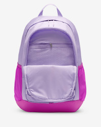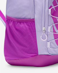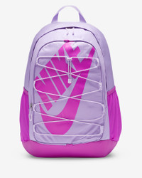 Leave no gear behind with the Nike Hayward Backpack. A front bungee system, two external zipped pockets and a laptop sleeve provide plenty of storage, while a chest strap and padded shoulder straps help optimize comfort for your haul. Benefits - Internal sleeve stores a laptop up to 15". - Padded shoulder straps are adjustable for a comfortable fit. - Side pockets hold a water bottle or other small essentials. - Densely woven polyester provides heavyweight support. Product Details - 13" W x 19" H x 9" D - Haul handle - 100% polyester - Spot clean - Imported - Shown: Hydrangeas/Hyper Violet/Hyper Violet - Style: HJ8200-515
